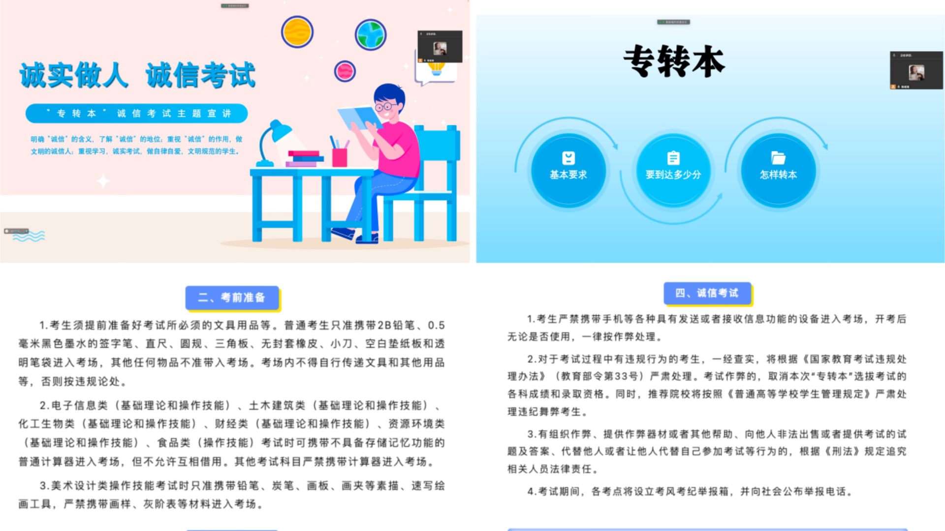 诚信,是中华民族的传统美德,孟子曰:“诚者,天之道也;诚之者,人之道也。”孔子亦曰:“人而无信,不知其可也。”在2024年普通高等学校“专转本”考试即将来临之际,民用航空系于3月14日开展诚信考试主题班会,意在提高同学们对专转本考试纪律的重视,不断增强诚信考试思想认识,本次班会由辅导员陈瑶瑶主讲,21级全体学生参加。