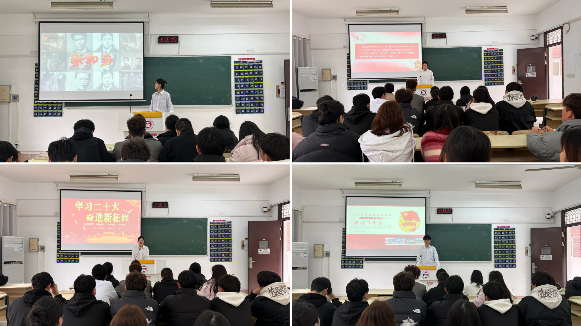 主题团课比赛现场,选手们围绕二十大精神,聚焦党的百年奋斗初心使命、辉煌成就和青年运动史,深入挖掘航天精神、五四精神、奥运精神等精神的深刻内涵,通过PPT陈述,进行了内容充实、逻辑清晰、真实自然的展示,具有较强的示范性、推广性,引领广大团员青年矢志不渝听党话,坚定不移跟党走。