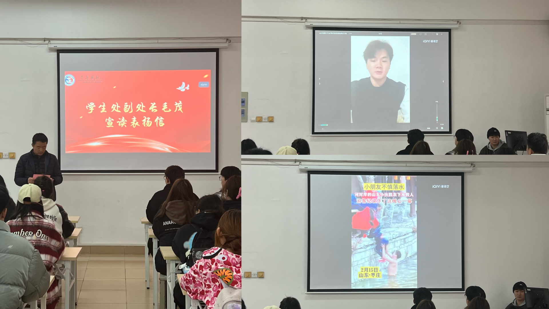 最后,吴慧主任在总结时先高度肯定赵子明同学的见义勇为行为,并表示这是学校“正德厚生”校训的完美诠释,立德树人育人成果的又一生动实例,她号召全体同学向赵子明学习,并提出三点希望,一是积极践行社会主义核心价值观,传递正能量,勇于担当社会责任,关心他人、服务人民群众。二是加强体育锻炼,提高身体素质,养成朝气蓬勃、斗志昂扬的精神风貌。三是认真学习专业知识,不断提高自身综合素质,培养创新精神和实践能力,练就过硬的本领,为自己的未来奠定坚实的基础。
