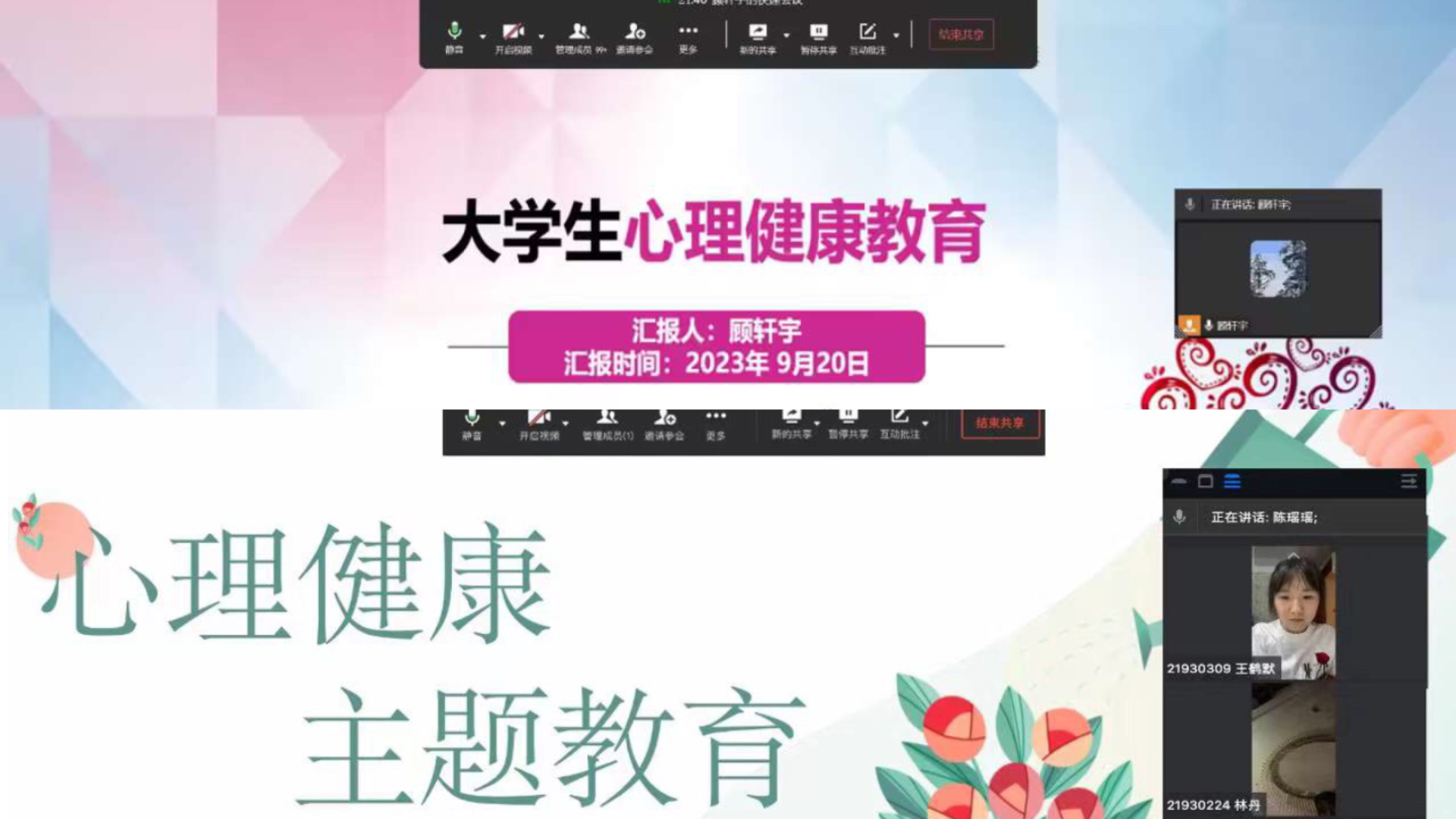 ⼼理健康是培养学⽣全⾯发展的不可忽视的重要⽅⾯,⼼理健康教育于大学生⽽⾔,恰似阳光之于小麦,绝不是可有可⽆,更不可随遇载量。辅导员顾轩宇首先从时代语境进行分析这究竟是一个什么样的时代?在时代语境下大众的心态以及价值取向,从而告诫全体学生要戒骄戒躁,树立“健康、自信、愉快”的心理态度。其次观看了微视频《大学生活 我太难了》,从初入大学产生困惑到积极转变心态从而实现人生理想追求幸福。辅导员陈瑶瑶老师说:幸福是有意义的快乐,大学生活时间很充足,要找到有意识的事情去做,要记着欣赏生活,要学会笑,要用心寻找生活中的真善美,勤于自助,善于求助,丰富人生经历,寻找人生幸福。
