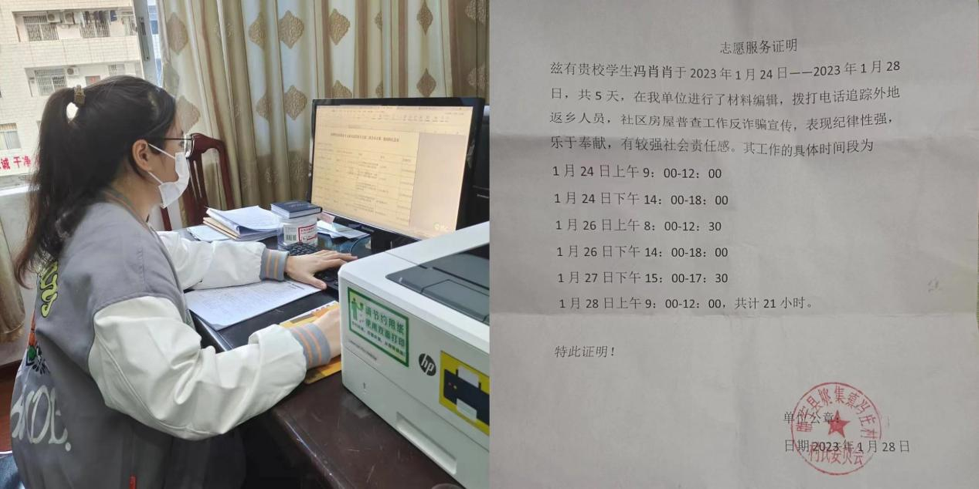 冯肖肖同学自愿报名成为了一名村委会社会实践志愿者。陌生的工作环境挡不住她炽热的激情,在同事们的悉心指导下,冯肖肖很快便掌握了工作流程,她的付出和努力得到了单位的肯定。冯肖肖在报告中写到:经过村委会的社会实践,我深刻感受到将理论转化为实践的不易,我也更加明白,只有在不断突破自我的实践中充实理论知识,才能够有能力以实际行动为家乡建设贡献自己的力量。以星火之名燃青春之光,是我们青年一代的使命。此次参加社会实践活动,让我接触到了许多以前不曾接触的内容,有助于我们这些在校生更新原有观念,吸收新的思想和知识。这是我走向社会的必经之路,我会好好去感悟,走好接下来的每一步。