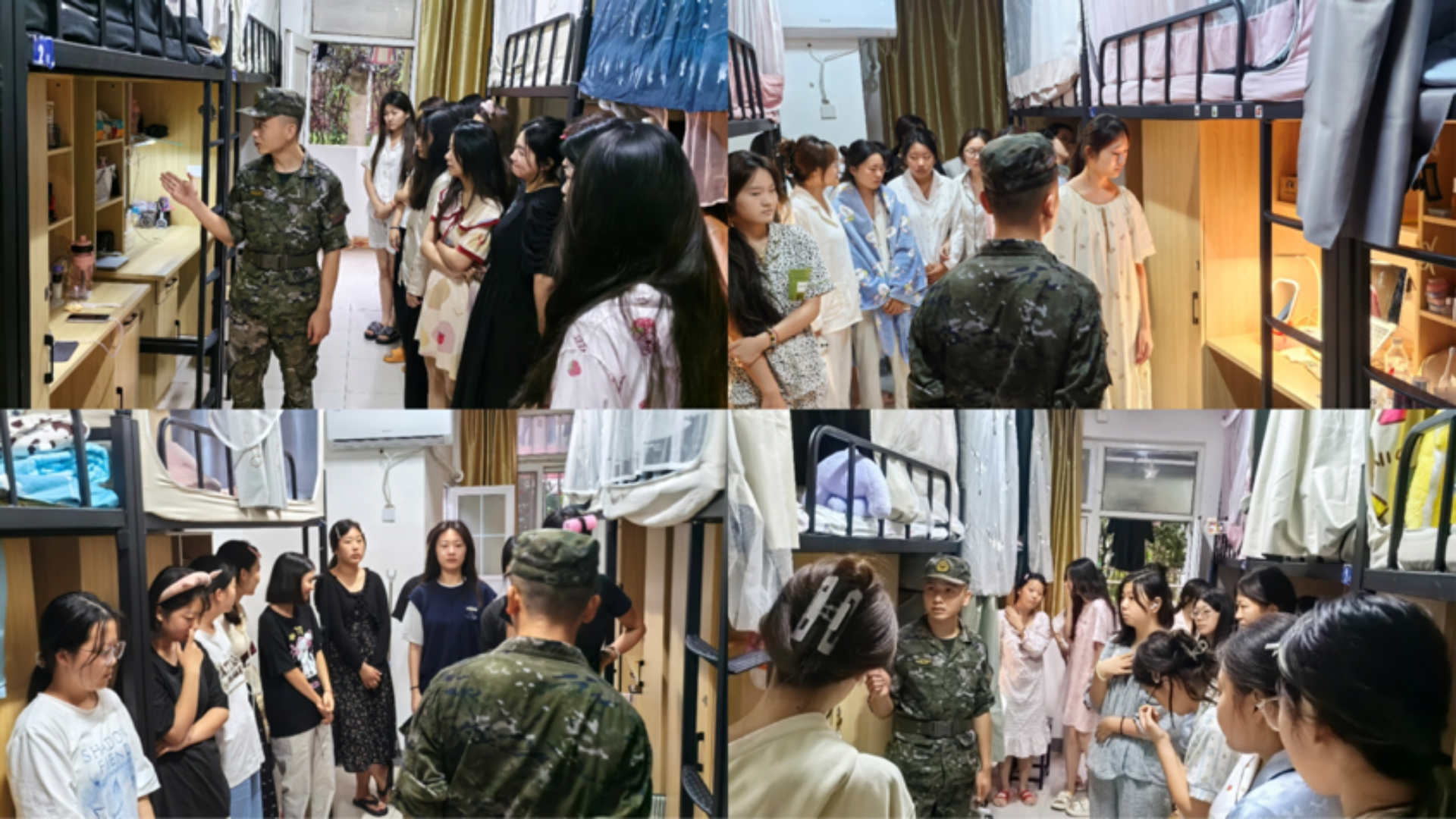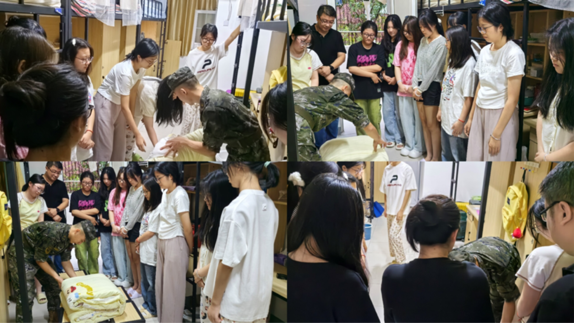 教官们一进入宿舍,就受到了新生们的热烈欢迎。首先,教官针对军训规章制度进行了细致解读。从作息时间安排说起,明确告知新生们早上的起床时间、午休时段以及晚上的熄灯时间等,强调了遵守时间规定对于培养良好纪律性的重要性。在宿舍管理规定方面,教官详细讲解了关于内务整理的标准,例如被子要叠成整齐的方块状、物品摆放要有序等,并且亲自示范了正确的内务整理方法,让新生们直观地学习到如何将宿舍环境保持得整洁干净。