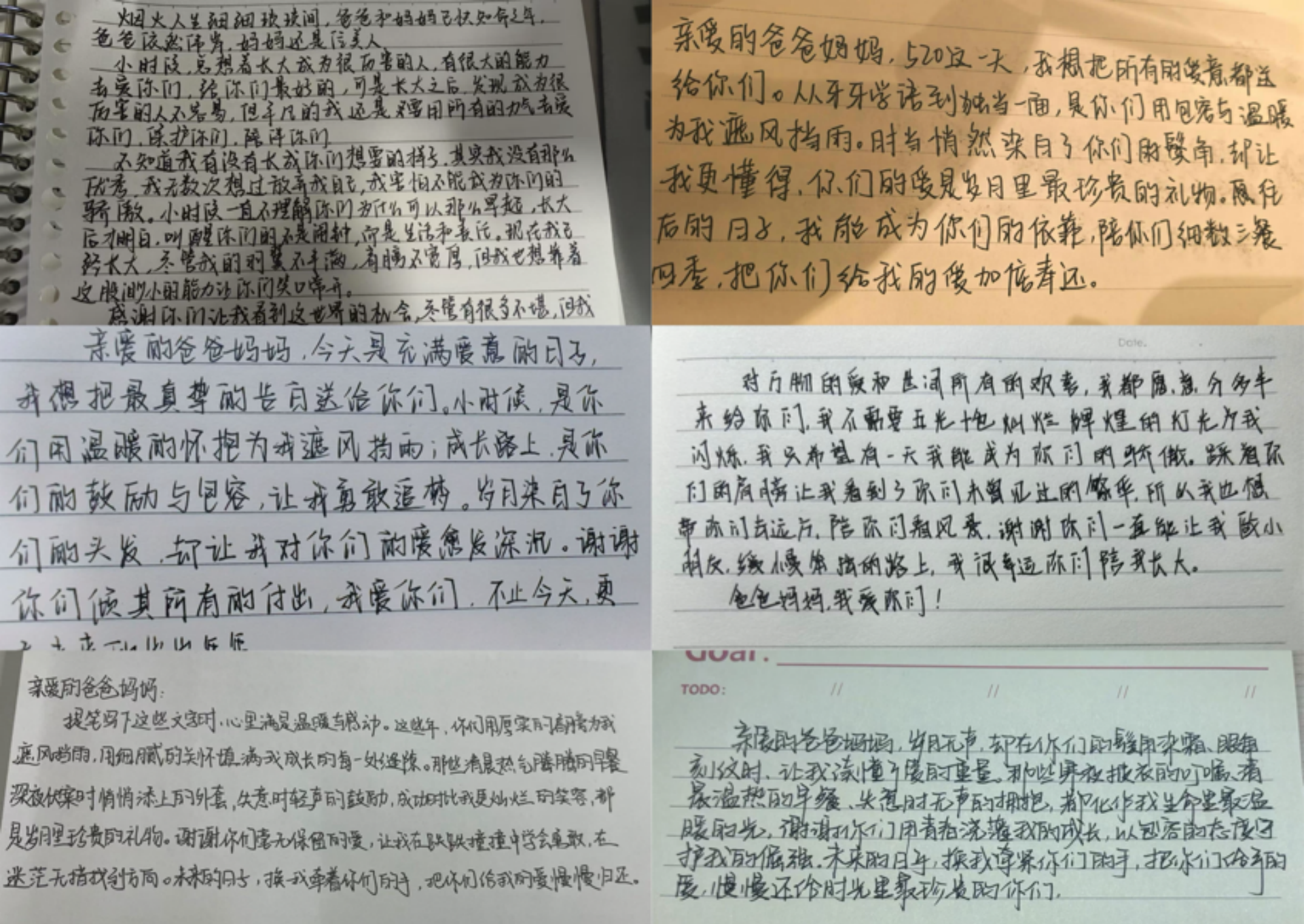 为了让同学们勇敢表达对父母的爱,深刻体会亲情的珍贵,民用航空系于2025年5月20日开展“爱要大声说出来”活动,2023级2024级全体学生参与。同学们纷纷通过文字向父母倾诉内心的情感,用最真挚的话语传递对父母的感恩与爱意。