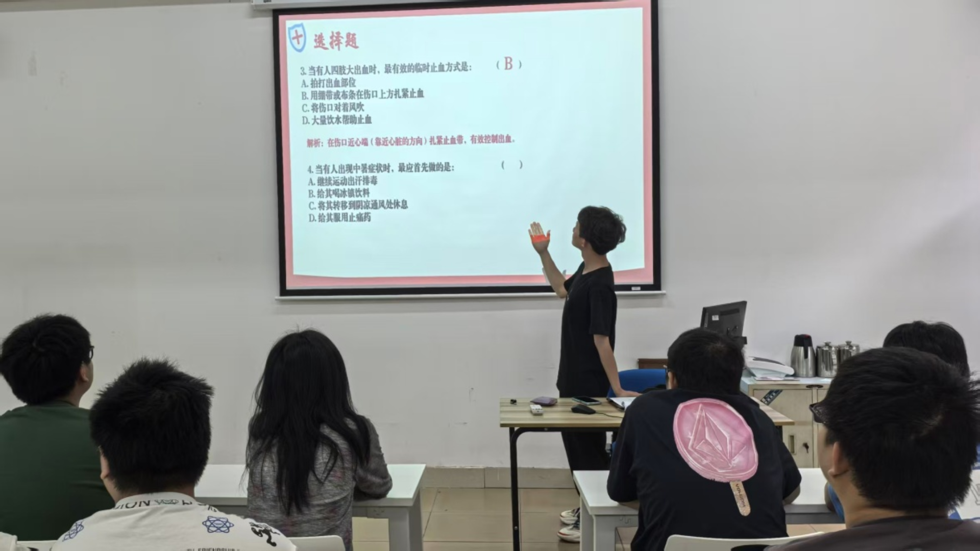 活动现场,一道道急救知识题目接连抛出,涵盖了大学生常见意外伤害处理、突发疾病应对等多个方面。面对问题,各组成员迅速反应,密切配合。有的组员眉头紧皱,在脑海中飞速搜索答案;有的组员则信心满满,率先按下抢答铃。激烈的角逐中,每个小组都全力以赴,展现出了良好的团队协作精神和扎实的急救知识储备。