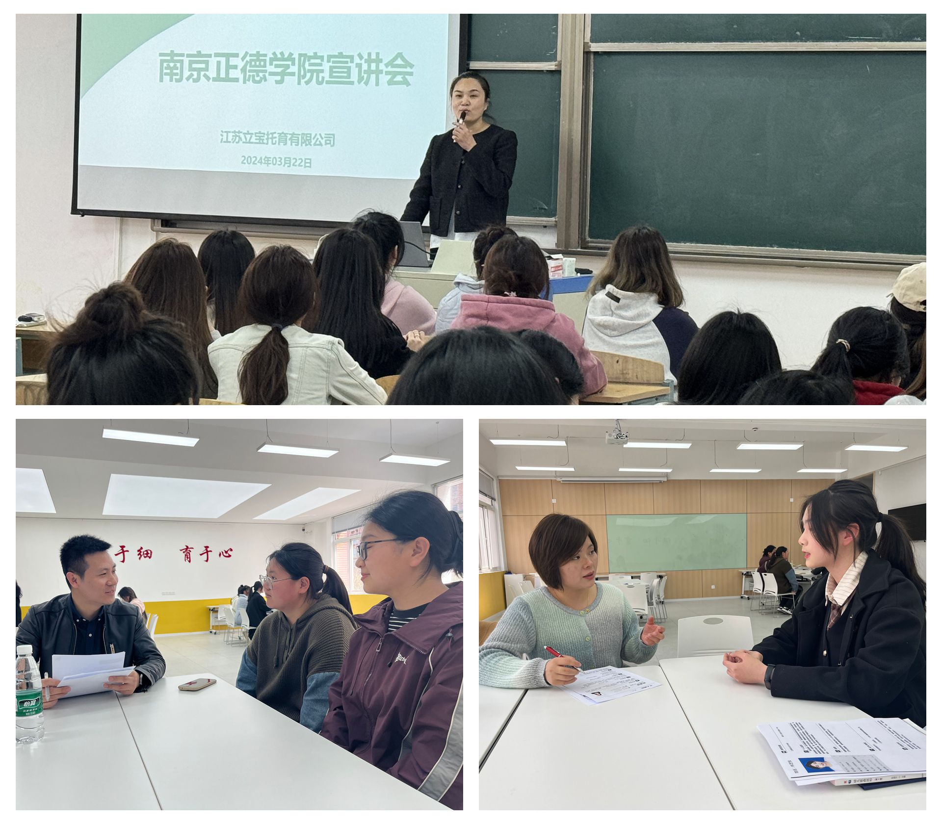 2024年3月22日,江苏立宝托育有限公司人事经理曹金娣带领南通、无锡总园园长到校为2022级在校生开展实习“订单班”宣讲招聘活动。基础教育系系领导、相关辅导员与专业教师共同参加了宣讲招聘活动。