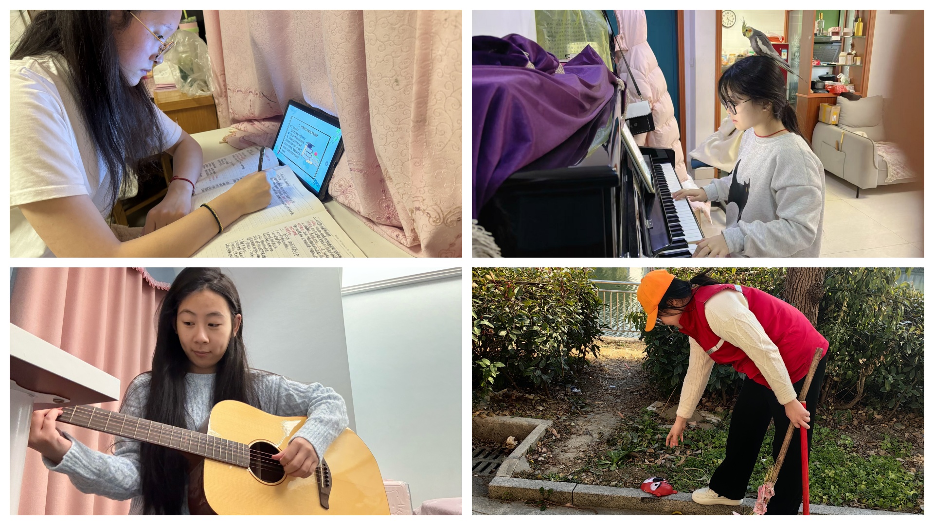 同学们在反复练习钢琴、吉他、古筝和书写毛笔字,在不断练习中提升自己的技能,并参与志愿服务为社区贡献一份力量,用多元实践活动,将美育、智育、体育、德育、劳育巧妙融合,让同学们在不同场景中全面发展,以实际行动诠释“五育融合”的深刻内涵。