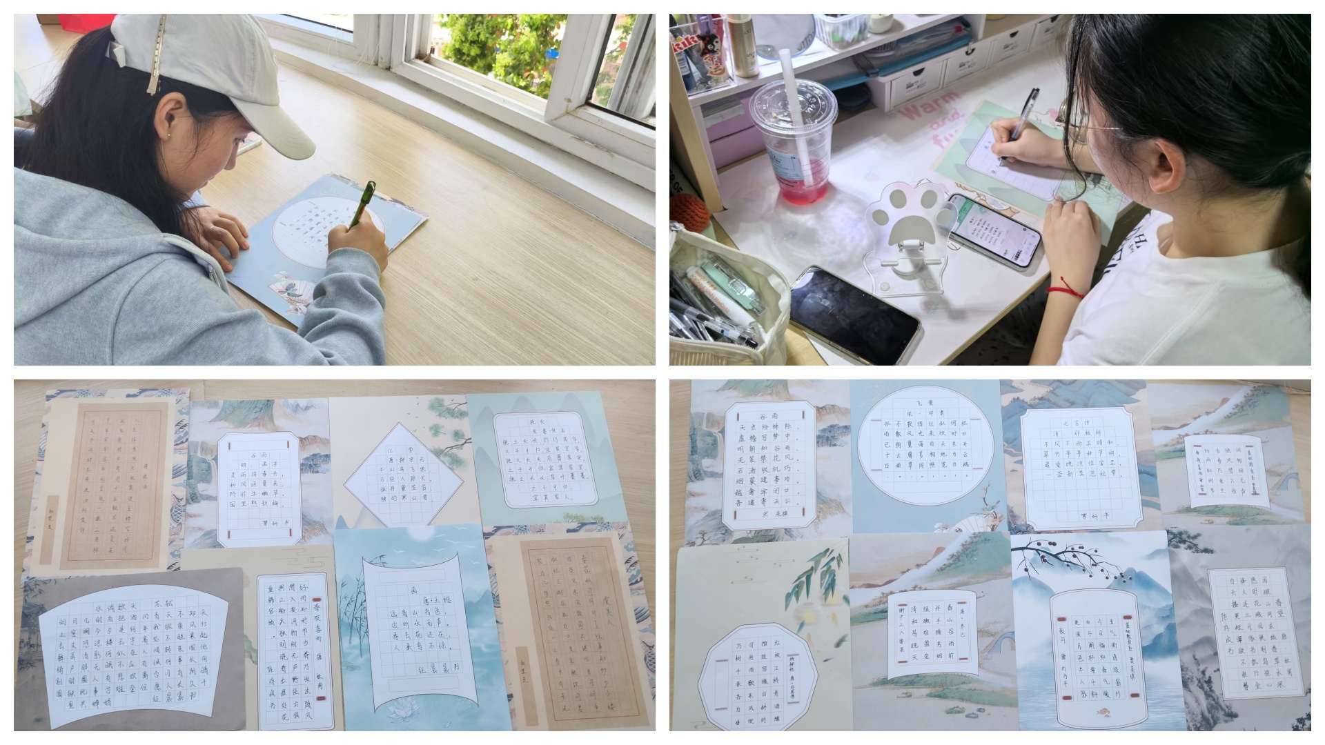 首先为同学们讲解谷雨节气的由来、习俗及文化内涵,结合杜甫《绝句》、韦应物《观田家》等与谷雨相关的经典诗词,引导学生感受古人对农耕时节的观察与抒情。学生们伏案执笔,在信笺上认真书写节气诗词、农谚俗语。王宇晴同学选择书写陆游《谷雨》中的“乡村四月闲人少,才了蚕桑又插田”,她表示:“通过书写农事诗句,更能体会古人顺应自然、勤劳耕耘的智慧,这也是我们师范生需要传承的精神。”活动现场展出优秀作品10余幅,或刚劲有力,或娟秀雅致,每幅作品都融入了学生对节气文化的理解。