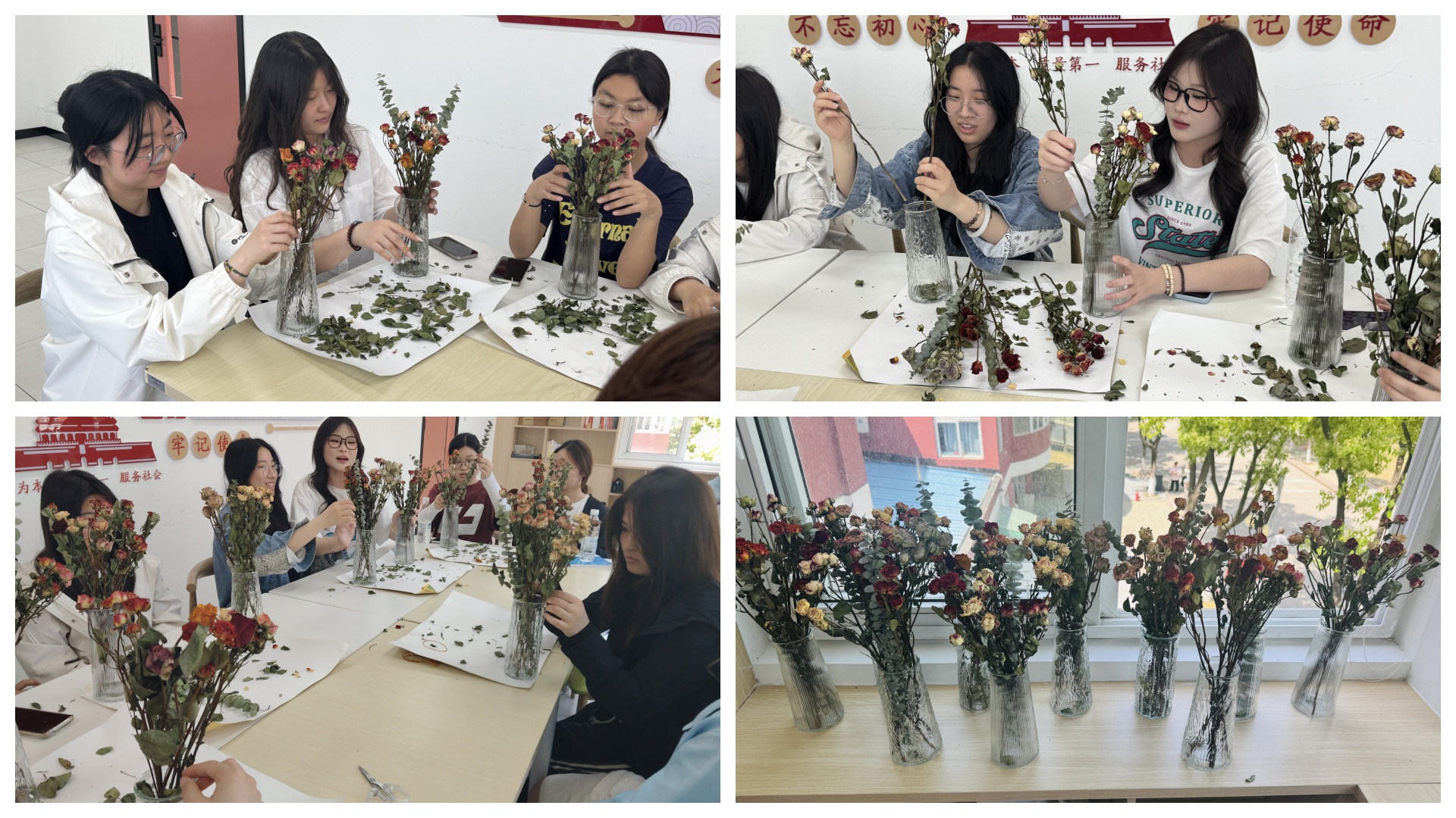 以“谷雨·春之馈赠”为主题,介绍了适合春季插花的花材——洋甘菊、康乃馨、尤加利叶、小雏菊等,讲解色彩搭配、层次设计与环保理念:“谷雨是‘生’的节气,我们可以用自然馈赠的花草,创作充满生命力的作品,同时倡导‘不浪费、巧利用’的插花原则。”学生们分组协作,修剪枝叶、搭配花型。同学们将粉色康乃馨与绿色蕨类植物组合成高低错落的花束,寓意“春雨滋养,万物生长”;创作过程中,同学们交流插花技巧,分享对节气与自然关系的感悟,现场洋溢着春日的生机与创意的喜悦。