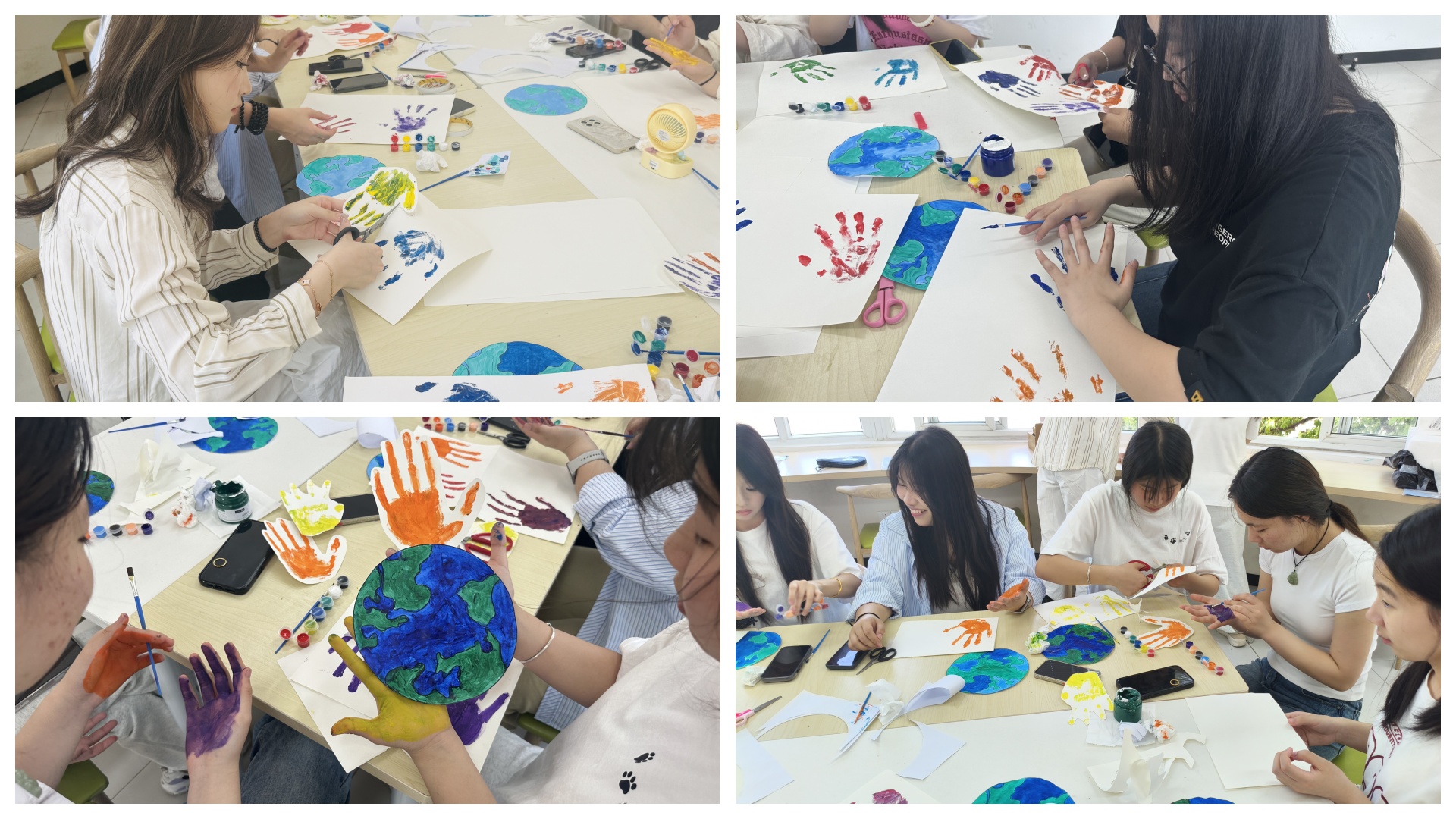 在“手印承诺”环节,参与者将手掌涂上各色环保颜料,在特制纸张上留下缤纷手印,并剪下粘贴在地球图案四周。这些五彩斑斓的手印不仅点缀了画面,更象征着青年学子用双手守护地球的坚定承诺与青春力量。