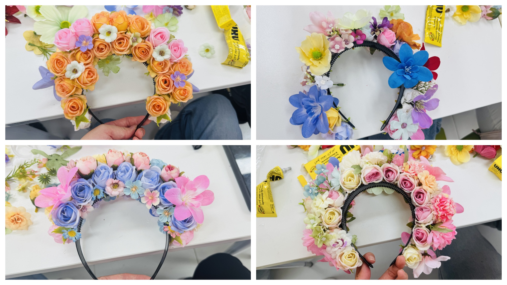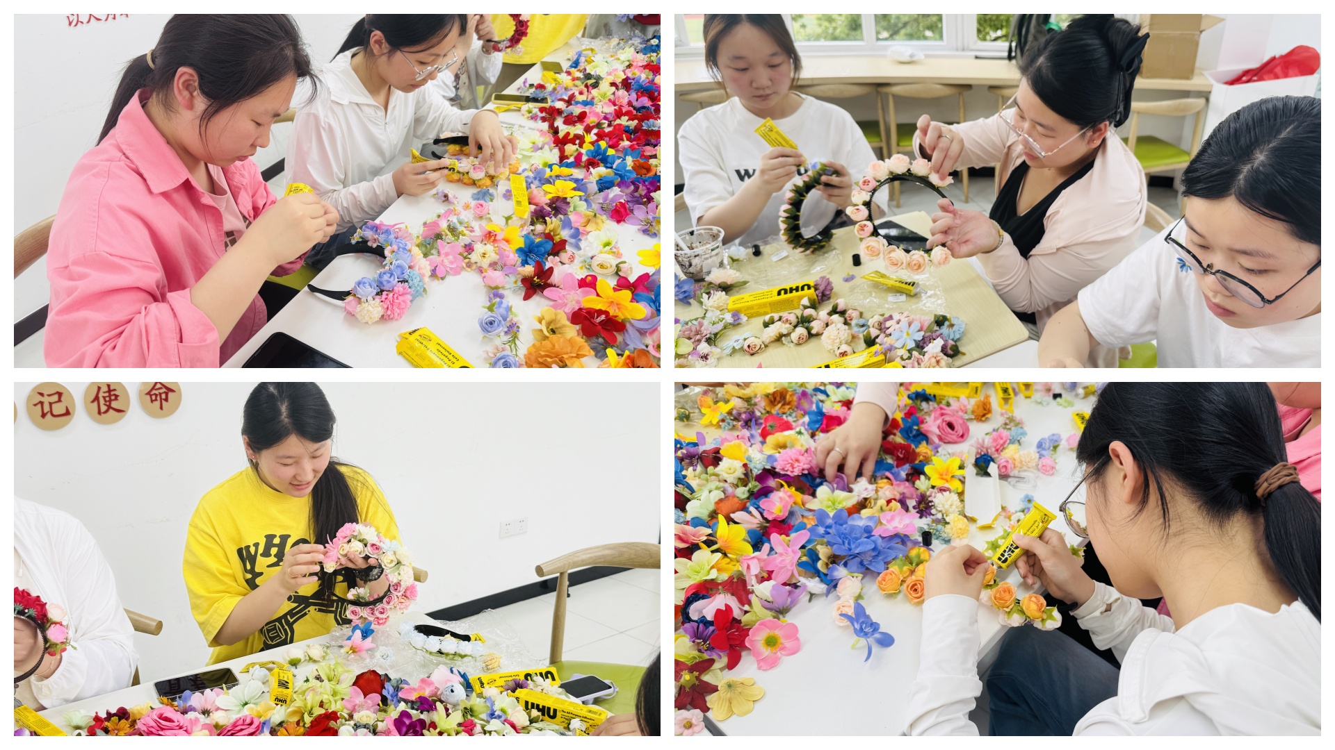活动现场,桌上摆满了色彩斑斓的绢花、牡丹、玫瑰等各式手工材料。同学们充分发挥创意与想象力,灵巧地将花卉组合、搭配,细致地将花苞一一粘贴于发箍之上。伴随着欢声笑语,现场氛围温馨而热烈。同学们沉浸在创作中,精益求精地打磨每一个细节。经过近两个小时的努力,一件件独具匠心的簪花发箍作品相继完成:或典雅端庄,或清新俏丽,既保留了传统韵味,又展现出现代审美,充分体现了学生们对传统文化的理解与创新精神。