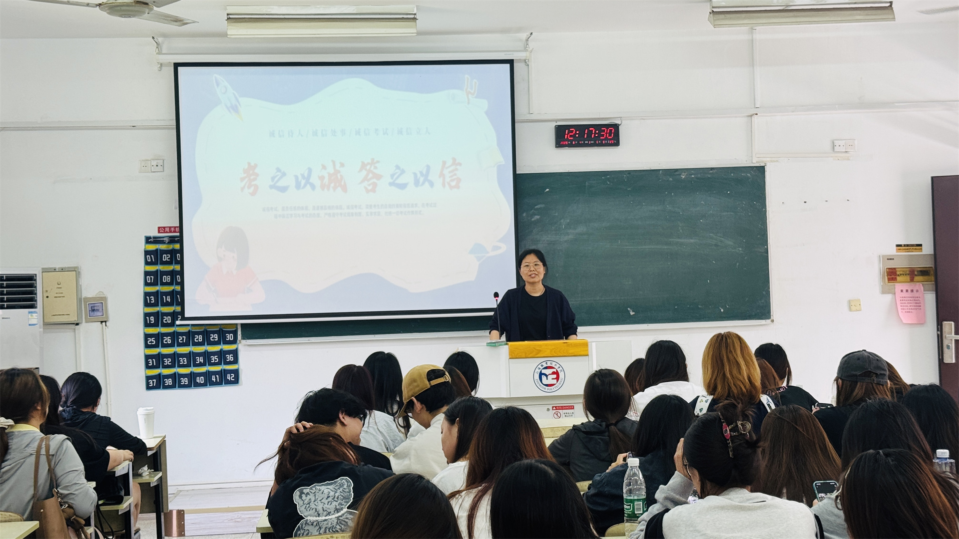 首先,辅导员沈言静老师组织召开了诚信应考主题班会。班会上,沈老师强调了考试诚信是学术诚信的重要体现,是每位学生应当恪守的基本准则。她鼓励同学们结合自身备考经历,分享时间管理的方法与高效学习的技巧,引导大家在备考过程中自律自强、诚实守信。
