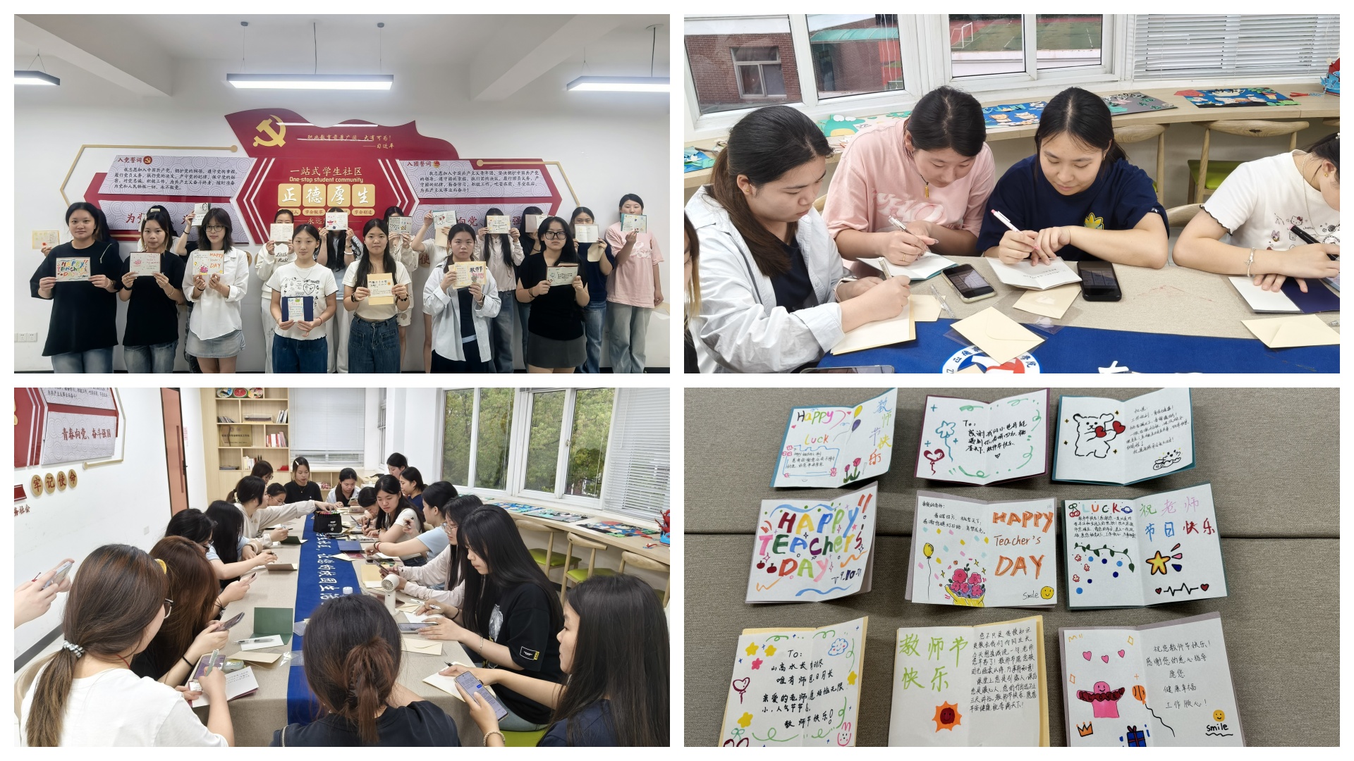 9月9日,我系组织同学们前往“南三一站式”学生社区制作教师节贺卡。活动中,同学们充分发挥创意与巧思,精心设计每一张贺卡。有的以彩笔绘出玫瑰与雏菊组成的迷你花束,花瓣色彩清新、丝带轻盈缠绕,旁书“春晖四方,桃李天下,感谢您提灯引路,育梦成光”。
