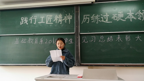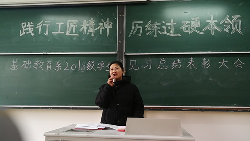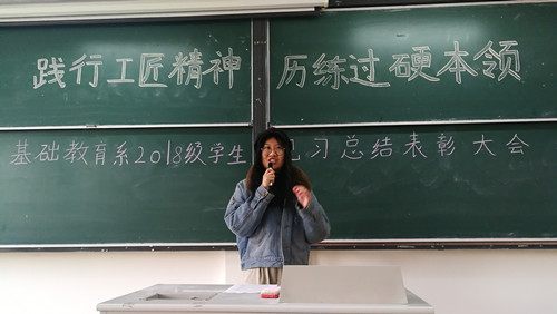 12月12日,基础教育系在1202教室召开了以“践行工匠精神历练过硬本领”为主题的2018级学生见习总结表彰大会。系主任杨卫东、揽翠苑幼儿园园长助理孙艳、专业负责人汪小艳、专业教师侯伟凤出席了会议。2018级全体学生参加会议。
