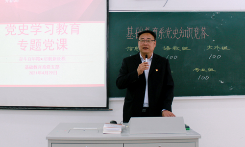 为贯彻中央《关于在全党开展党史学习教育的通知》精神,根据天博体育 党委的统一部署和要求,4月29日下午,基础教育系党支部在2206教室开展了“知党史、强党性、担使命”主题党日活动。系主任詹勇虎、党支部书记杨卫东及该系全体教职工、学生入党积极分子参加了活动。活动由支部书记杨卫东主持。