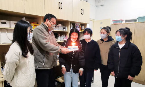 为表达对同学们的关心,作为宿舍四位同学导师的思政教研部主任杨卫东,和该系副主任、党支部书记杨春娟、辅导员刘翠云老师一道,专门准备了生日蛋糕,送到了学生宿舍,和同学们一起为小仲过了一个简朴热烈的生日。当三位老师来到宿舍,表达了生日祝福后,小仲同学抑制不住心中的激动。在同学们的帮助下,她点燃了代表专业特色的三支蜡烛,默默地许下了心中的愿望,在老师和同学们的祝福中,幸福地吹灭了蜡烛。杨卫东还特意关照同学们,要注意安全,严格遵守天博体育 关于疫情方面的各项规定;要互敬互爱,互相帮助,团结一心共克时艰。