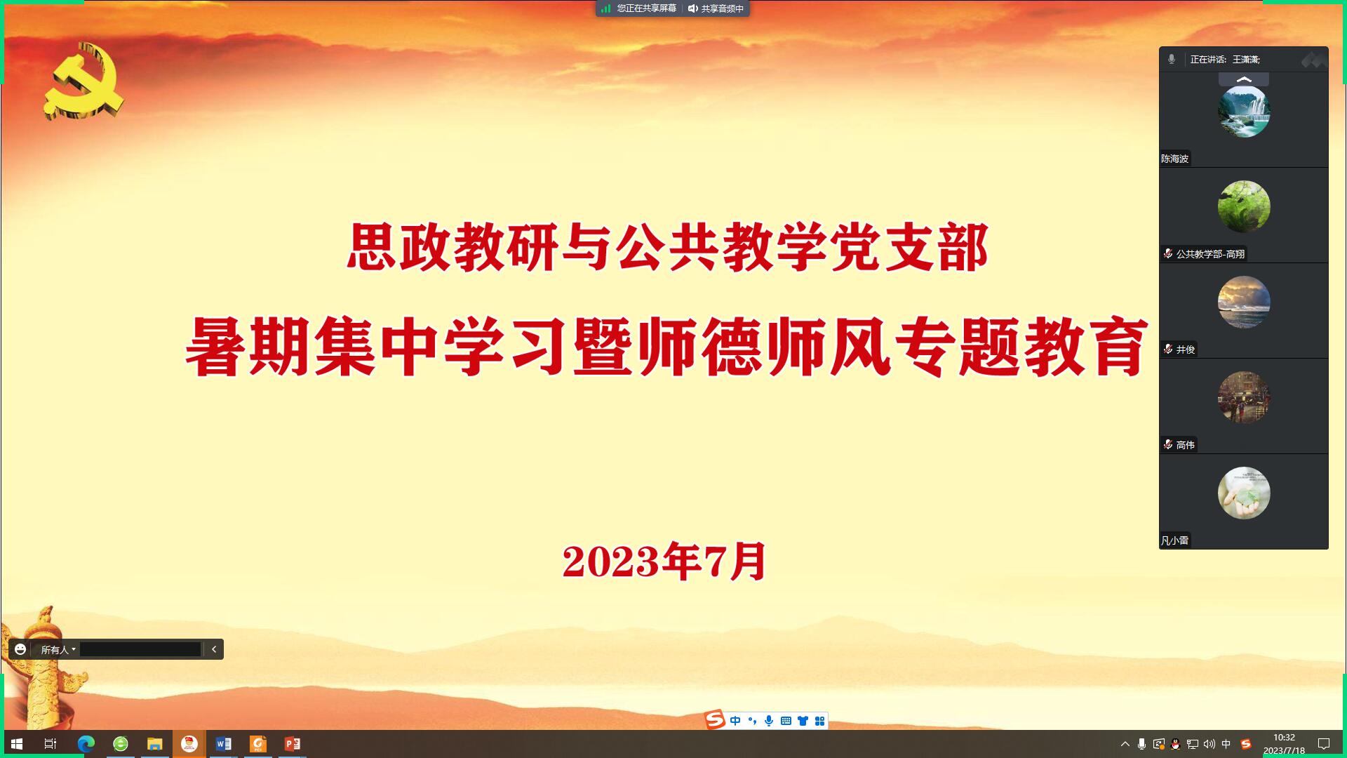 7月18日上午,思政教研与公共教学党支部利用在线形式召开了暑期集中学习暨师德师风专题教育会议。支部全体党员和非党员教师参加了会议。会议由支部书记杨卫东主持。
