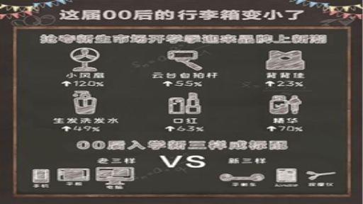 跟80后、90后相比,00后的开学的行李箱 “缩小”了,他们不用自己带去学校。天猫数据显示,小于24英寸的登机行李箱在开学前夕迎来一波销售高峰。许多大一新生开学人未到,包裹已经“先声夺人”,在开学前夕,天猫上的被褥、毛毯、换季衣服销量也水涨船高。这些订单的收件地址中,高校占据了很大比例。