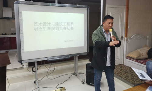 为了引导我系同学们明确定位自己的发展方向,发掘自身的潜能,提高自己的就业竞争力和综合素质,我系于2021年4月22日下午两点在实训室一楼展示厅举办了艺术设计与建筑工程系职业生涯规划大赛。担任本次比赛评委的有我系陈宏波副主任,我系团总支书记崔杰老师,我系辅导员范小军老师、王家甲老师以及廖晶晶老师。