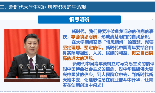 最后,大家都能够明白且深切的认识到,若在大学期间获得“慎思明辨”的智慧,就要坚定理想、坚定信仰。新时代中国青年要结合自身实际与祖国、人民、民族的利益,树立自己崇高的远大的理想,让理想信念在创业奋斗中升华,让青春在创新创造中闪光!