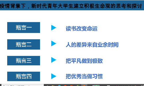 虽然长时间因为疫情的原因,我们的学习和生活受到了影响,也有一些小的困惑, 但是大家都能够学会自我排解,知道我们不能把这种短暂的失败无限放大,更不能用自身的缺点和不足去否定优势和长处,更不能武断的否定自己甚至自怨自艾。