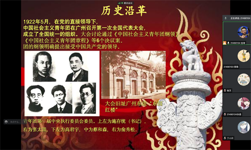 为庆祝中国共青团成立100周年,团结和凝聚团员青年力量,引领青少年进一步学党史、悟思想、办实事、开新局,引导广大青少年厚植爱党、爱国、爱社会主义的情感,艺建系2021级新闻班团支部于2022年4月6日晚开展了“庆祝建团100周年,青春建功新时代”主题线上团日活动。本次团日活动由团支书沈琦主持,班级全体同学参加。