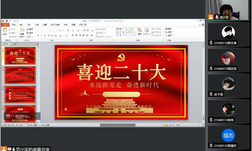 为认真学习习近平新时代中国特色社会主义思想,深入贯彻落实习近平总书记关于教育的重要论述,深刻感悟“两个确立”的决定性意义,增强“四个意识”、坚定“四个自信”、做到“两个维护”,以迎接和学习宣传贯彻党的二十大,艺建系大一年级于5月4日晚上8:30组织学生开展“喜迎二十大、永远跟党走、奋进新时代”主题线上团会。
