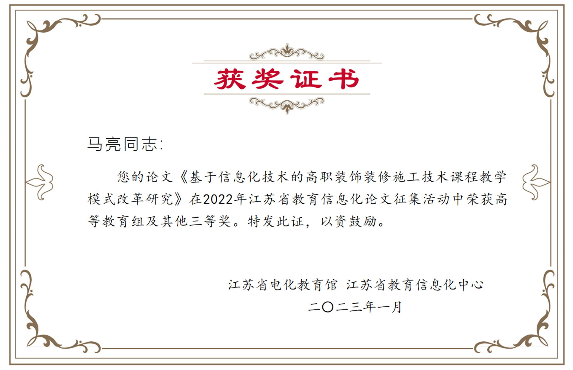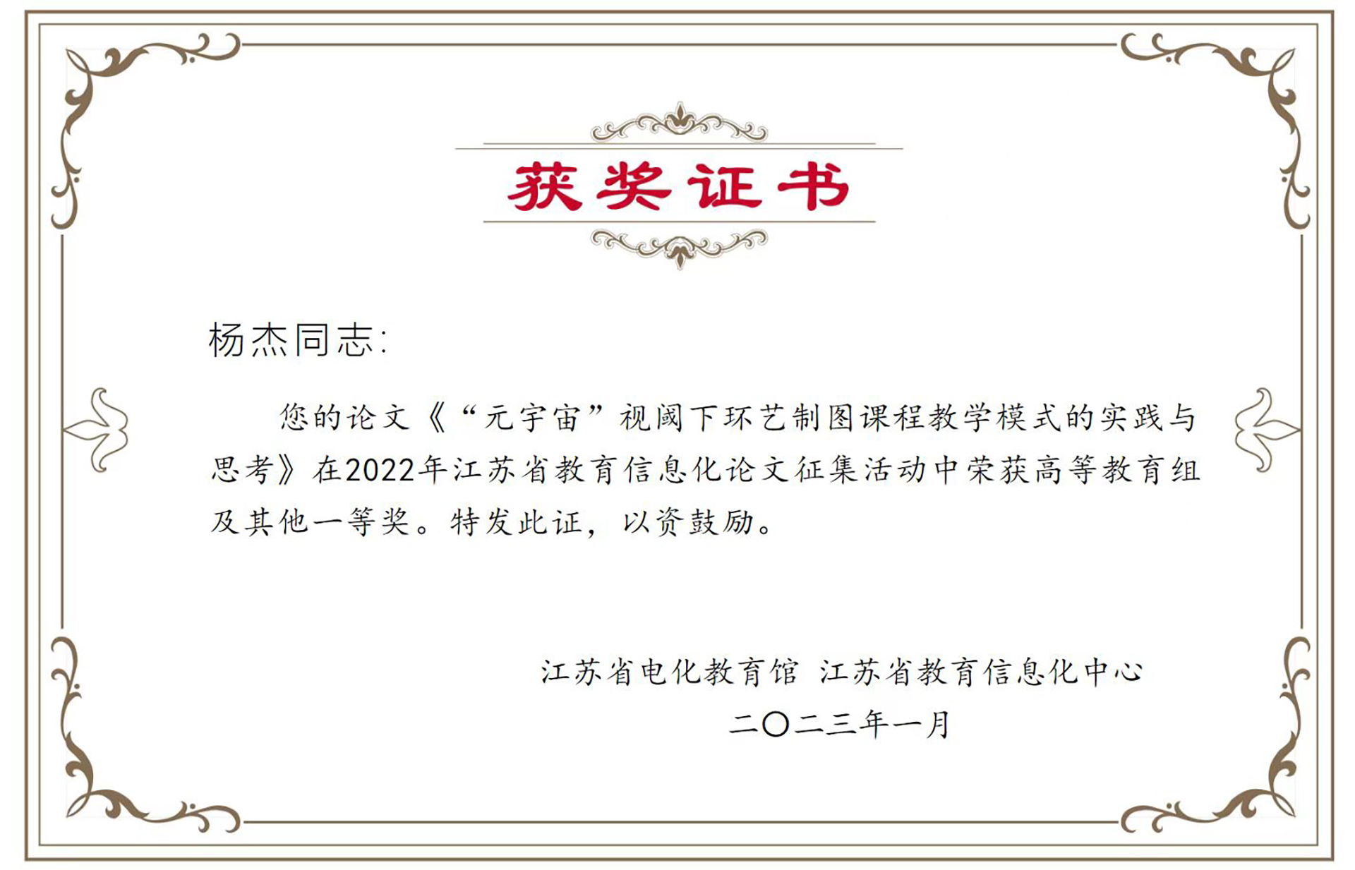 在2022年江苏省教育信息化论文征集活动中,艺建系共有两位老师获奖,其中杨杰老师的《“元宇宙”视阈下环艺制图课程教学模式的实践与思考》论文荣获一等奖,马亮老师的《基于信息化技术的高职装饰装修施工技术课程教学模式改革研究》荣获三等奖。