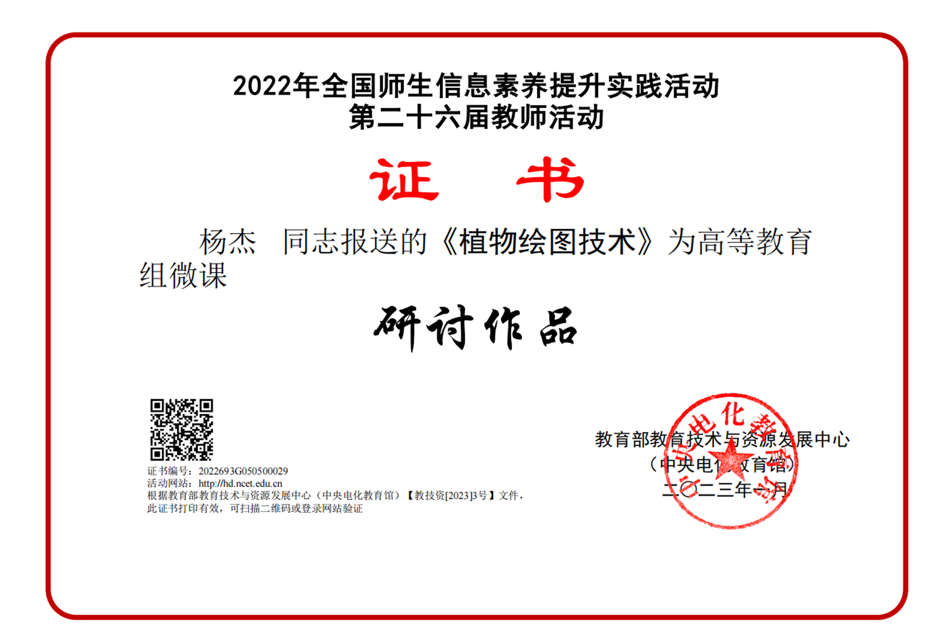 在近日由教育部教育技术与资源发展中心 (中央电化教育馆)主办的2022年度教育技术微课活动,天博体育 艺术设计与建筑工程系杨杰老师的微课《植物绘图技术》荣获“研讨作品”。本届微课活动是由“省赛-国赛”的竞赛体系构成,省赛获奖的作品经遴选后,送往国赛进行竞赛。