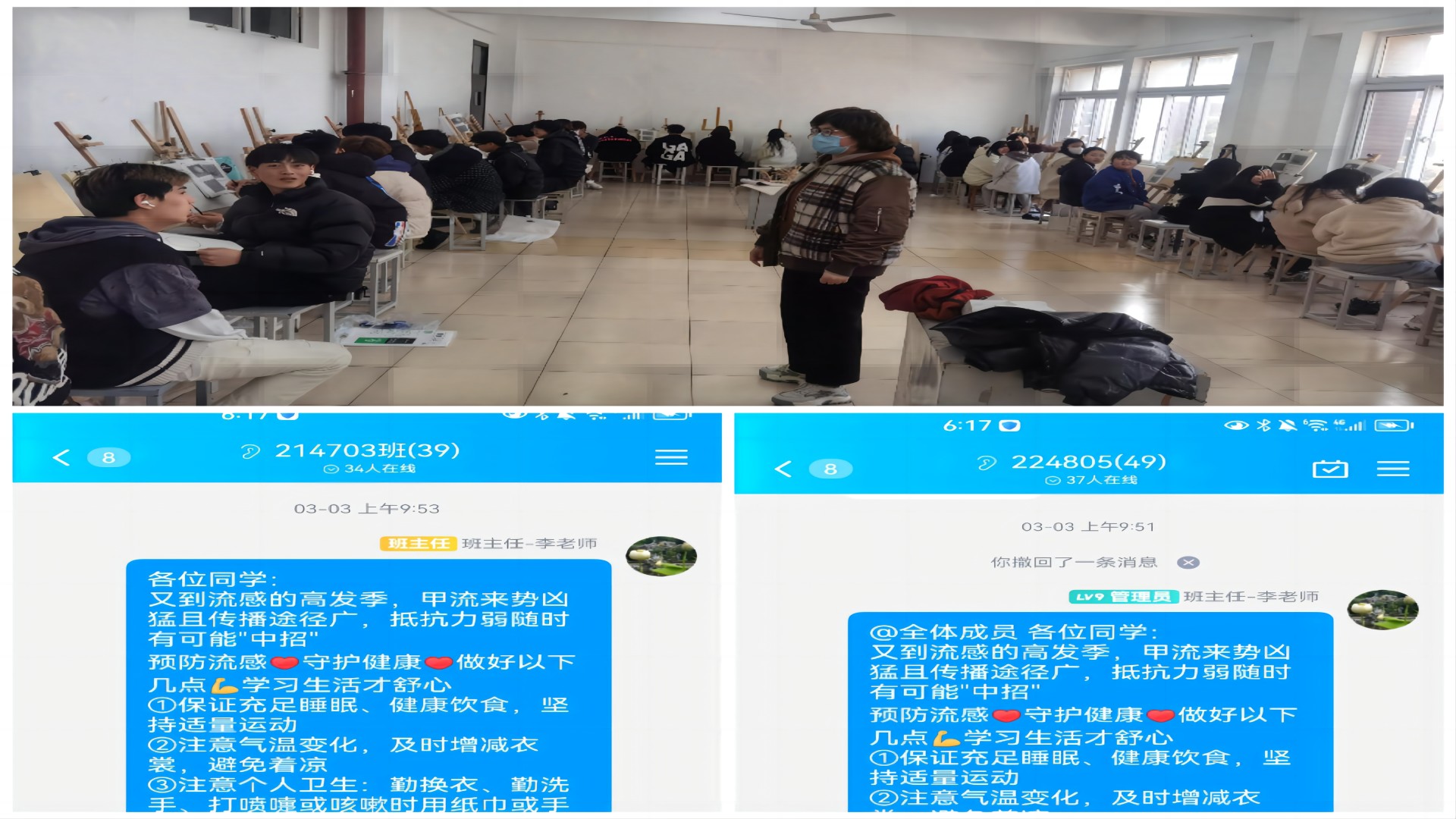 冬春季节更替,气温多变,细菌及病毒种类繁多,甲型流感高发。为使学生增强对春季传染病预防知识的了解,有效预防和减缓春季传染病的发生,工程造价李卉和时永玲两位老师走进班级介绍甲流相关知识以及预防措施。