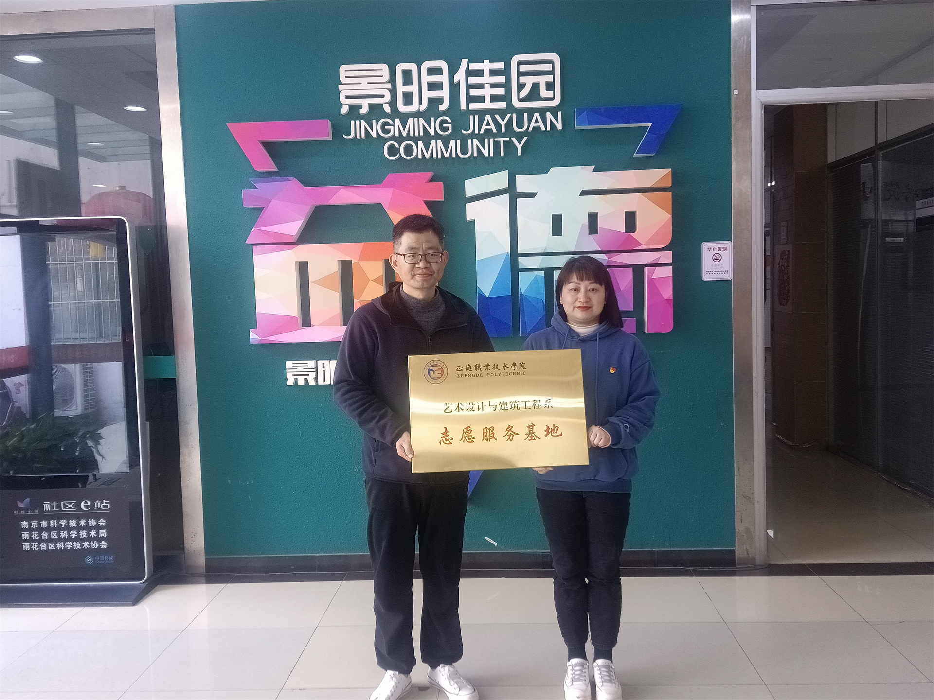 为加强校地共建、区域联建,帮助大学生更好了解社会实际、服务人民群众、提高社会化能力,切实加强大学生社会实践与志愿服务工作,3月28日下午,在铁心桥街道景明佳园社区会议室,艺术设计与建筑工程系与铁心桥街道景明佳园社区联合举办了隆重的“大学生社会实践基地”合作共建挂牌仪式。艺术设计与建筑工程系周卫副主任、系党支部陈宏波书记、辅导员程启芳及景明佳园社区党委副书记刘思思、景明佳园社区党委委员李正红等出席了仪式,部分社会实践团队学生代表参加了仪式。仪式由景明佳园社区党委委员李正红主持。