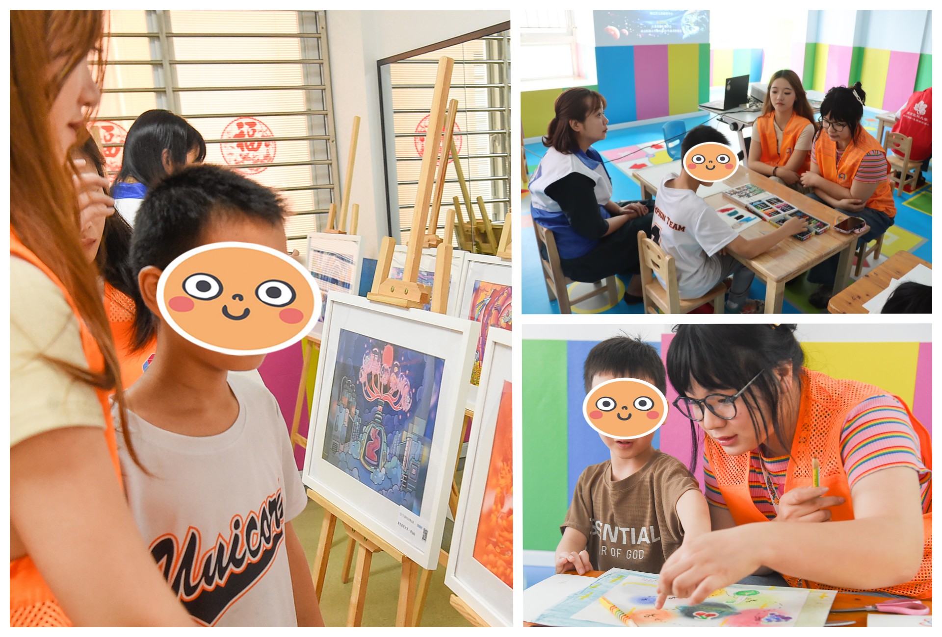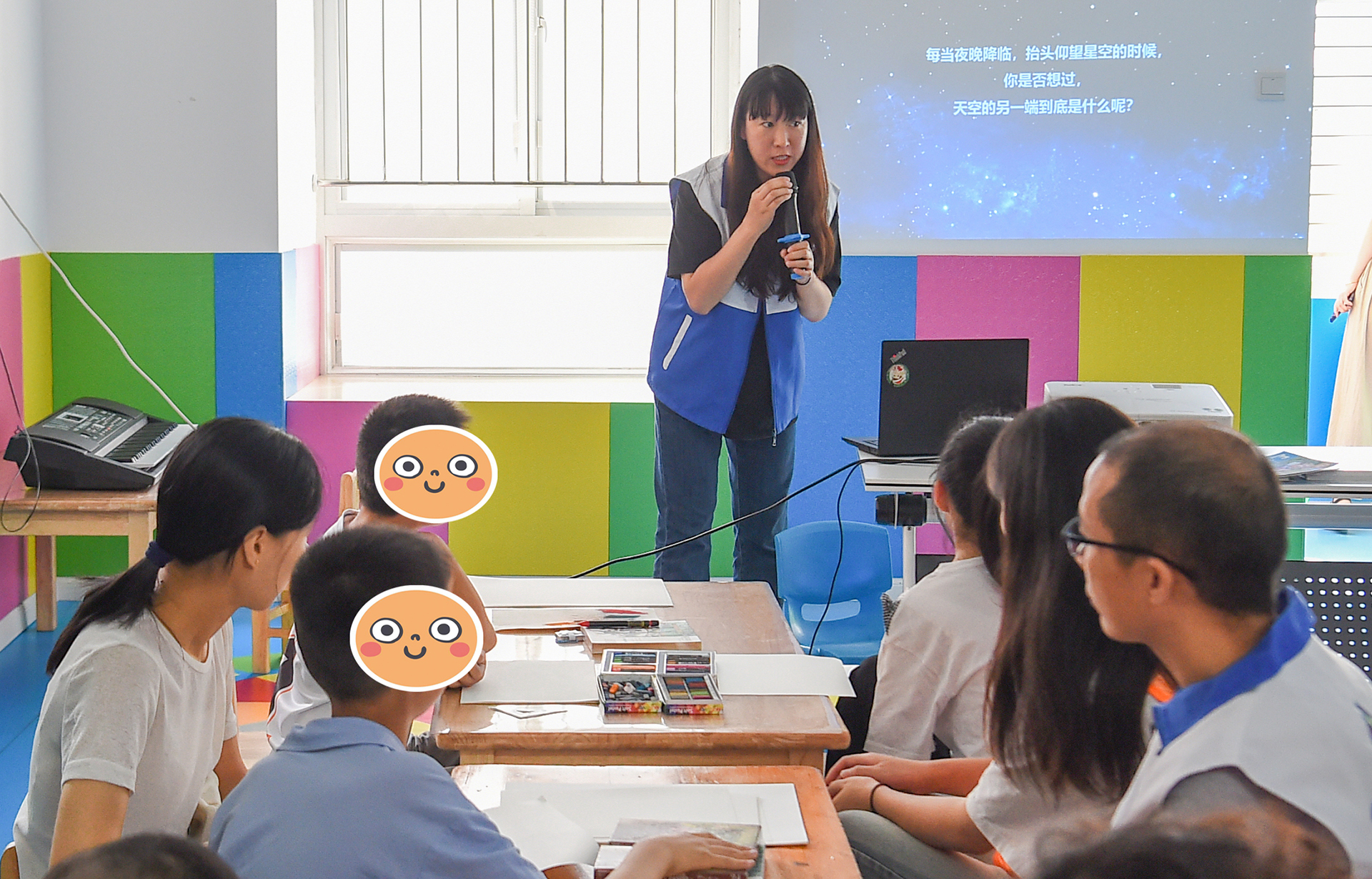 此次公益活动共分为绘画创作、科普讲座与插画展览三个部分。在“‘艺’ 颗红星——我们的天空”主题单元,正德天博体育 的徐老师向孩子们介绍了宇宙、行星和中国航天知识,以精美的图片和视频引导大家畅想宇宙之美。引导结束后,在南医大与正德天博体育 师生志愿者们的帮助下,孩子们尝试用色粉、彩铅、油画棒涂抹着自己心中的宇宙,稚嫩的笔触和绚烂的色彩形成了一幅幅独具想象力和艺术审美的作品,展示了星孩们无以言表但丰富多彩的内心世界。