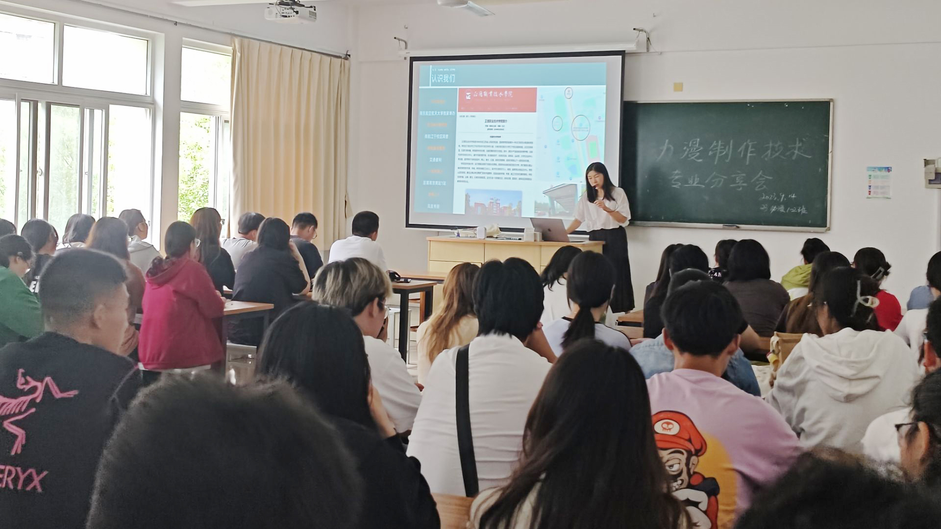 专业负责人刘凤老师对目前动漫行业现状及未来动漫行业发展趋势做了详细介绍,重点为学生们讲解了本专业的培养目标、课程体系、学历提升(专转本、专接本、出国留学)、岗位实习、就业方向、优秀校友等内容。
