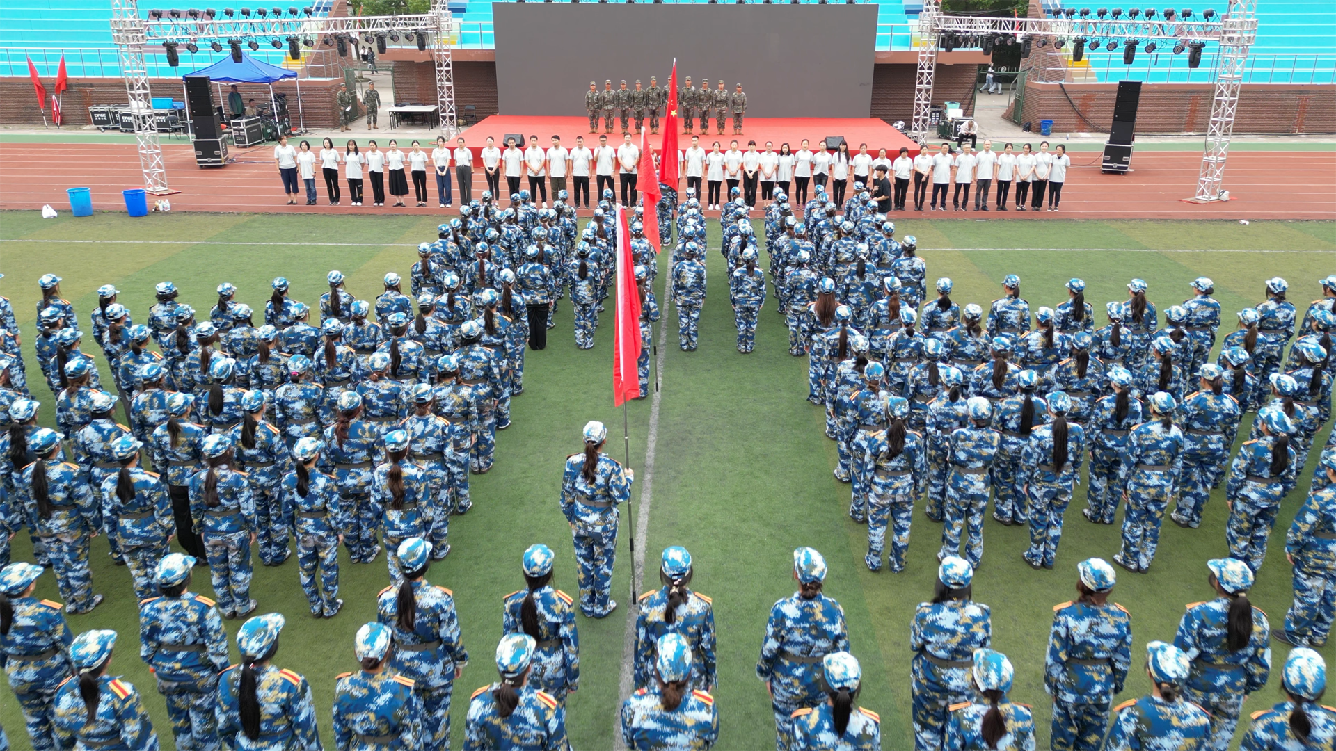 百余年风雨话祖国沧桑巨变,七四载征程赞中华伟大复兴。今年是新中国成立74周年,在国庆佳节即将到来之际,艺术设计与建筑工程系于9月27日中午在天博体育 的田径场举办了23级全体师生齐诵爱国口号的活动。