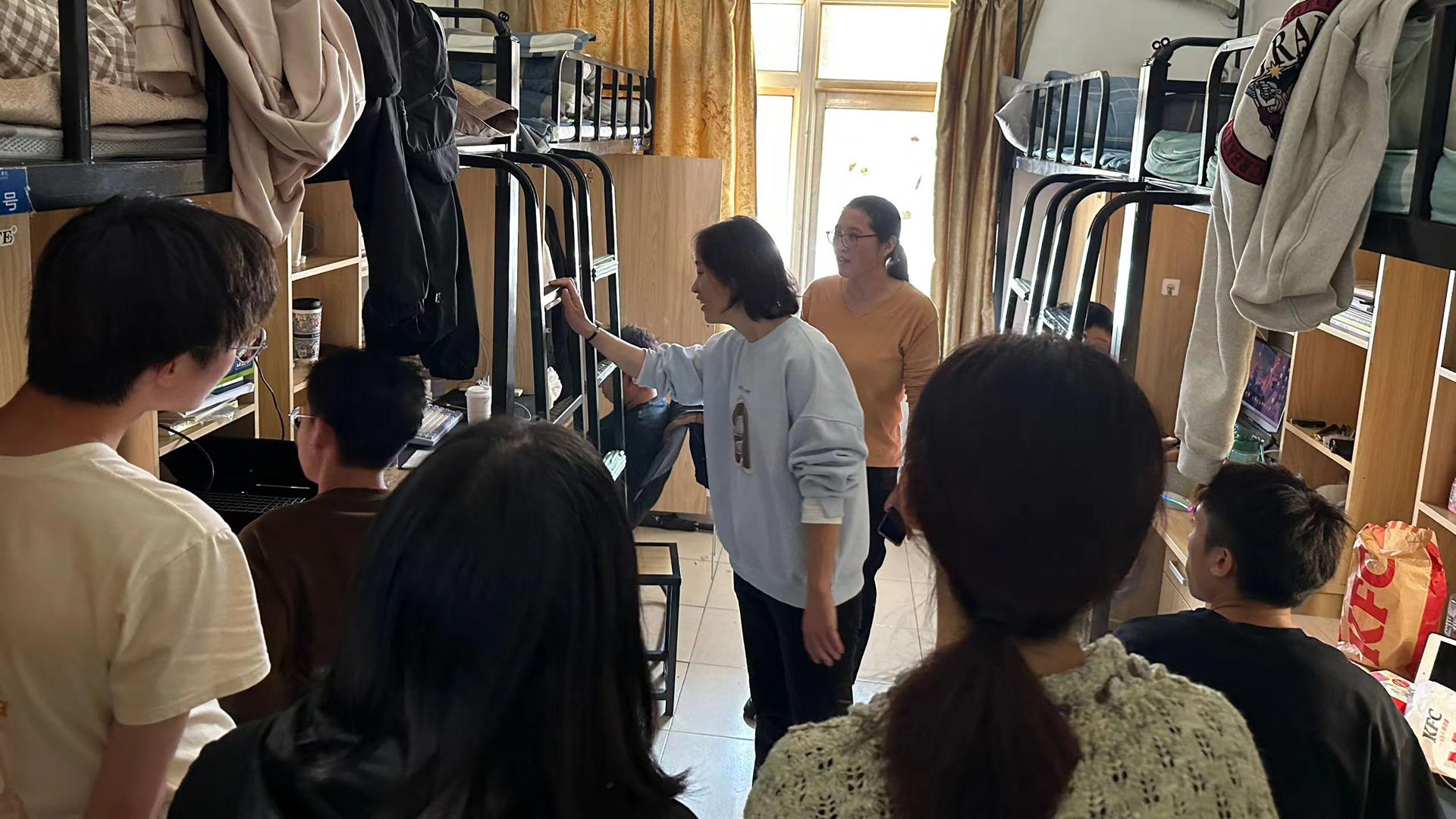走访宿舍进一步拉近了班主任与同学们之间的距离,让班主任更全面地了解学生的在校生活,从而更好地走进学生、帮助学生,加深了师生间交流,深化了师生间的感情。同时班主任进宿舍也能了解各寝室内务、卫生等情况,帮助同学们减少宿舍安全隐患,为同学们营造舒适安心的寝室环境。