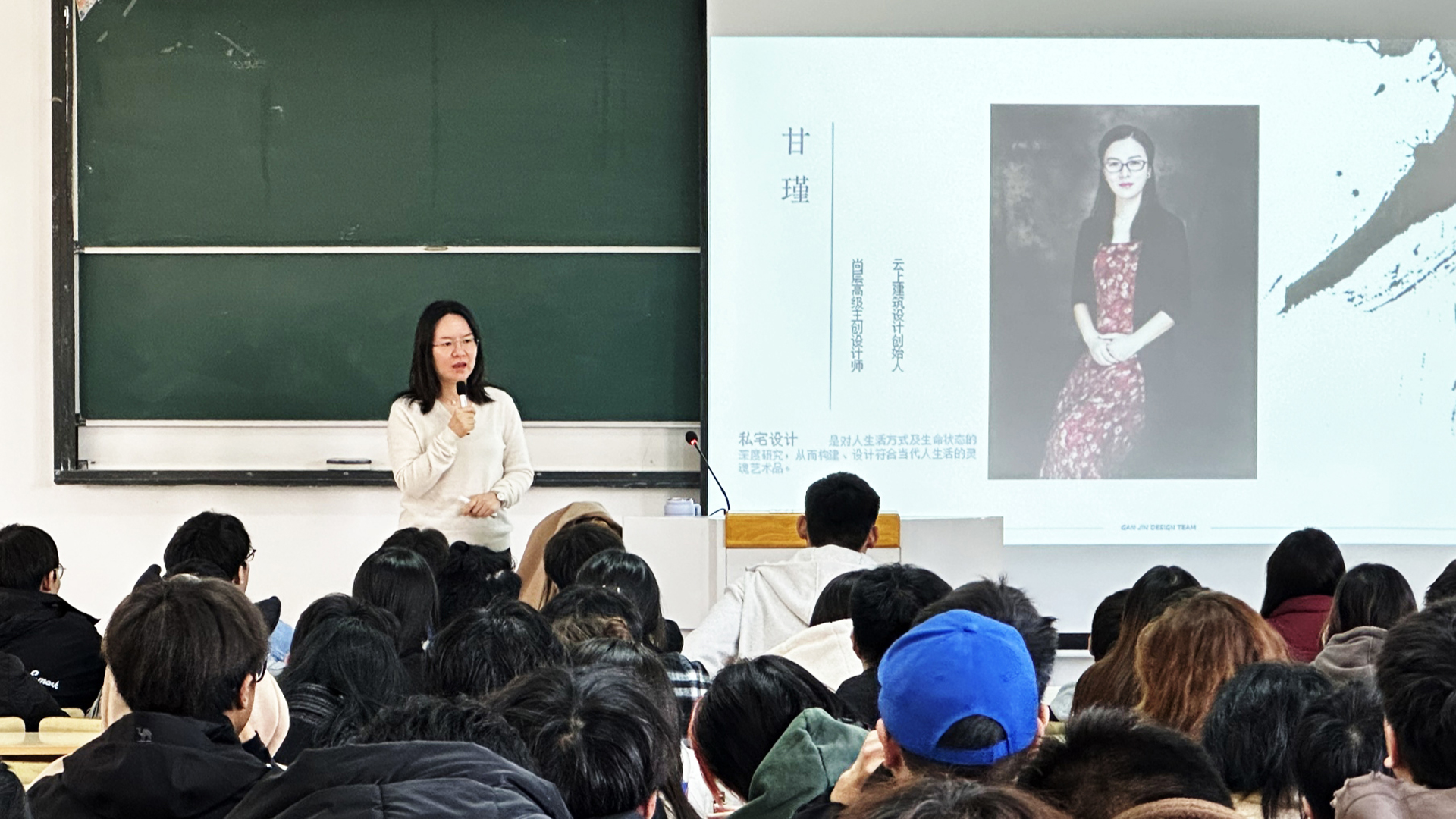 接下来甘瑾通过自己近期的设计案例作品,从项目概况的调研、设计要点的分析、空间的规划、建筑的再规划、主空间设计表现,到景观设计定向、能源系统定向、整体资金规划等详细讲解了别墅的设计流程。对照设计图纸和实景图片把各项流程中的细节进行了大量举例说明,生动介绍了全案设计的设计思路和设计方法,毫无保留的分享了自己作为主创设计师工作经验。讲座中还和同学们们进行了互动交流,建议同学们学会用专业角度观察身边的每一个建筑空间,去发现问题寻找解决路径,带着思考走进课堂、接触老师,利用好业余时间从书籍、自媒体资源积极拓展知识量;学会让所有的学习过程有新鲜感、有价值、有深度、有意义。