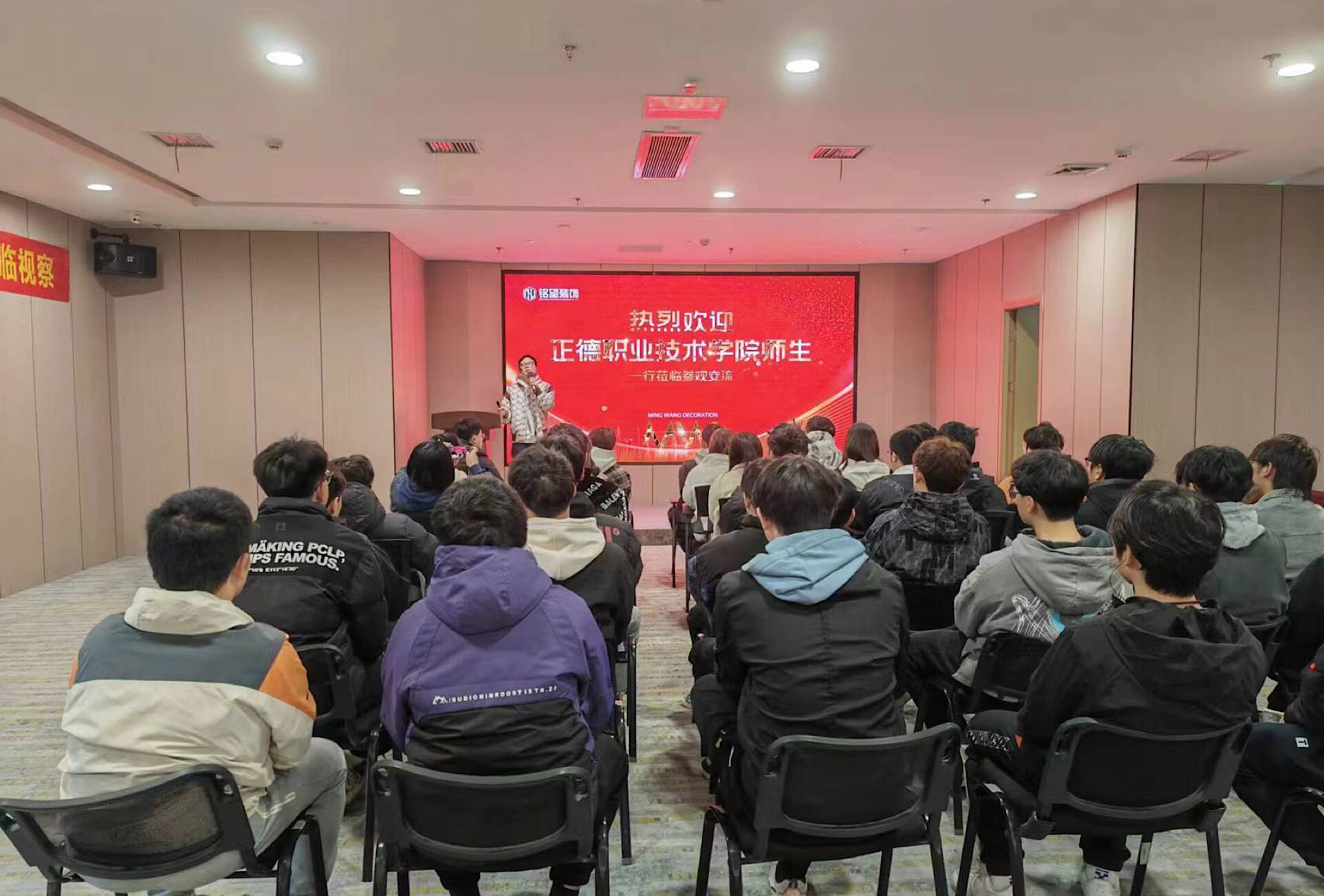 在南京铭望装饰设计有限公司吕主任的热情接待下,同学们观看了公司天博体育及企业规模介绍视频,了解到铭望装饰是全新的第九代家装模式,整合装修设计、建材、施工等资源,为业主提供集家装设计、建材选购、家具家电配送等一系列一站式家装服务的家装公司。立足于“以质量求生存,以信誉求发展”的经营方针,具有良好的口碑,做了很多室内设计项目。同学们了解到目前室内装饰设计的现状,优秀的设计师是如何成长的,团队协作的重要性等一系列问题,每位同学的内心也有了答案。