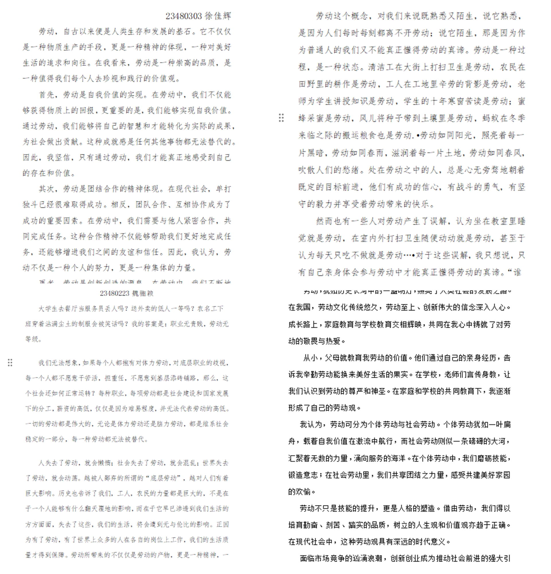 书写“我的劳动观”,文字最强音。同学们以对劳动的感悟和自己对劳动意义的理解展开写作,通过具体的事例和生动的描述,歌颂劳动者顽强拼搏的奋斗精神,赞美劳动人民的无私奉献,体现了同学们对劳动的深刻理解和尊重。