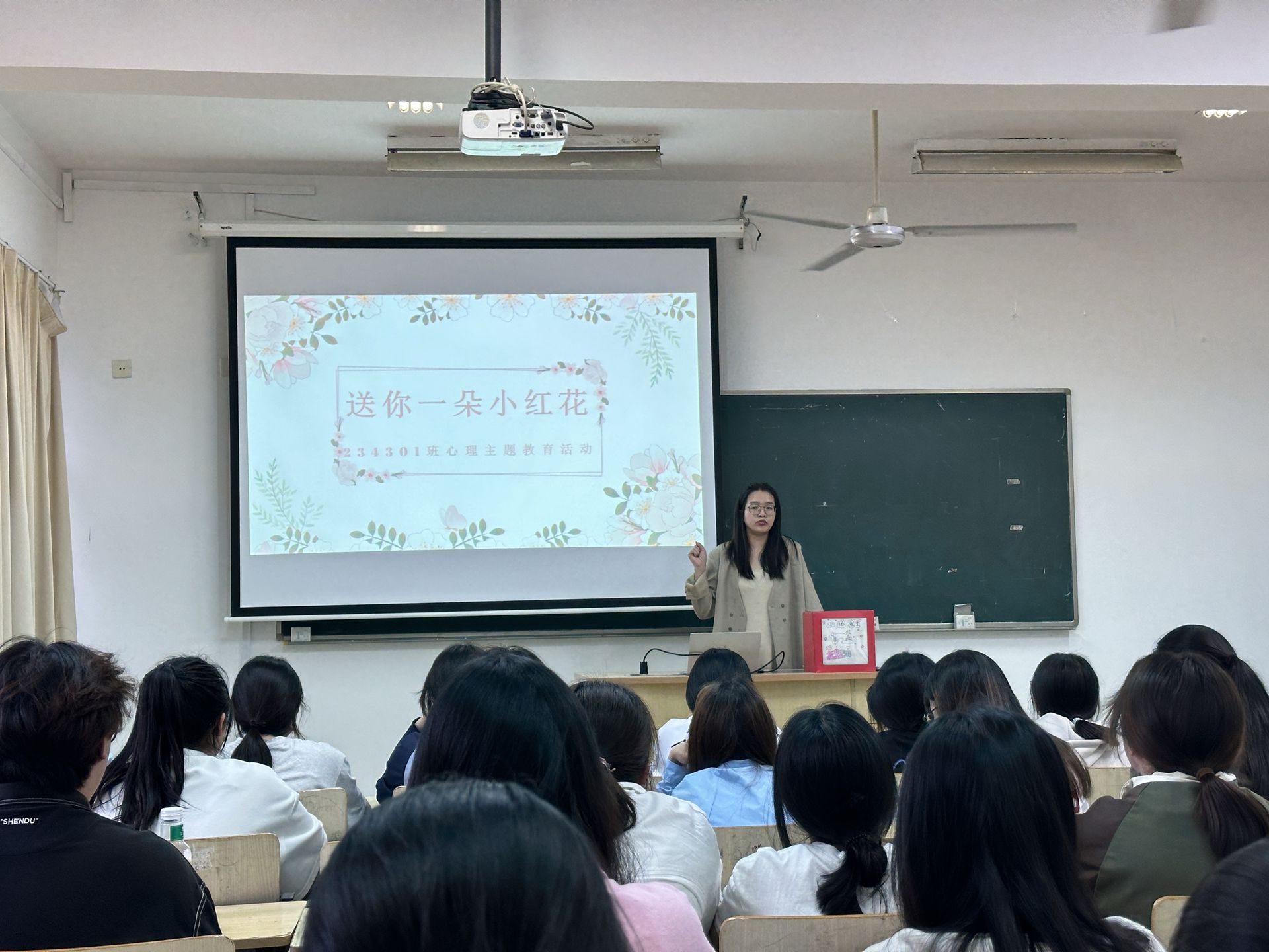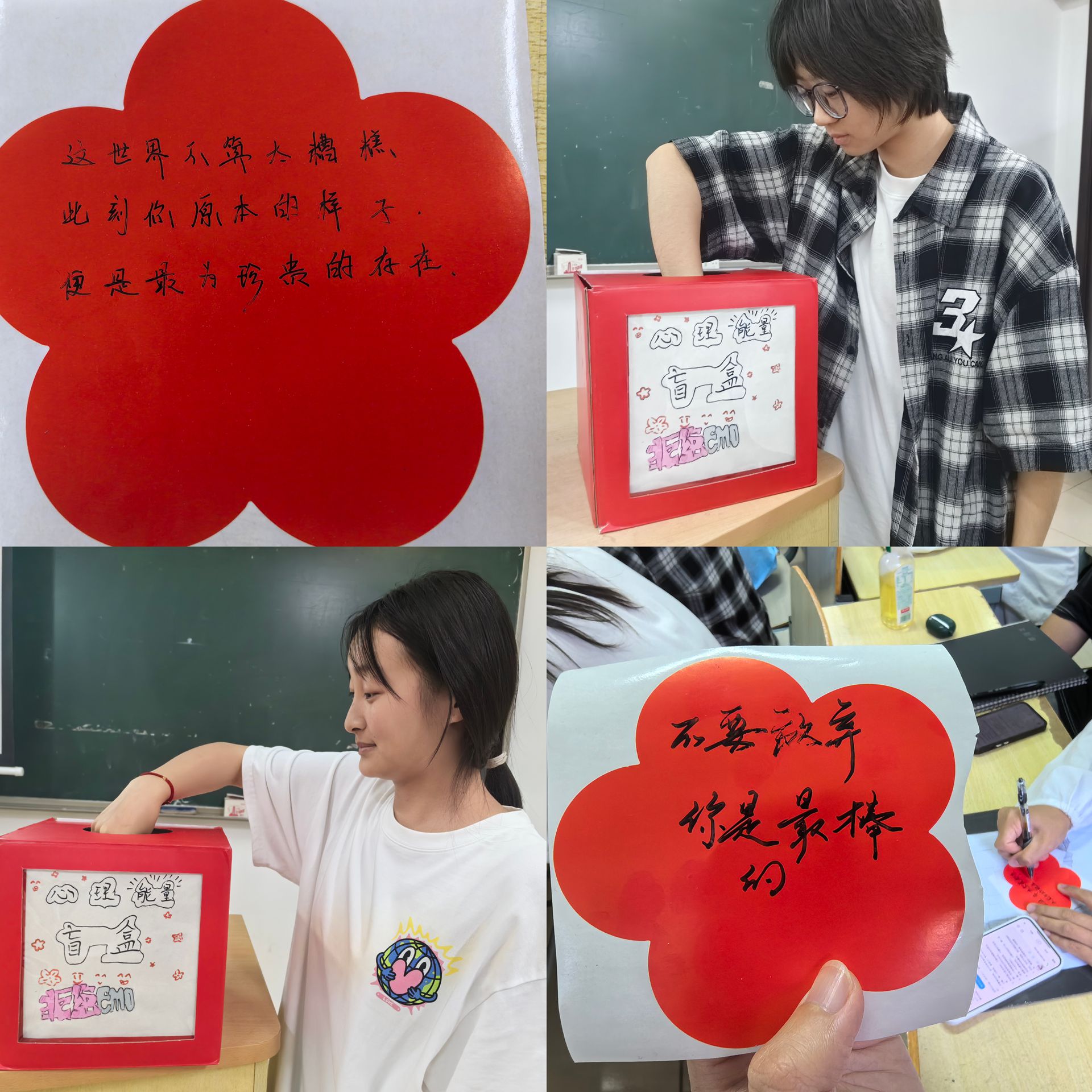 5月14日,王思思老师举办了“绽放内心光彩——送你一朵小红花”心理健康教育活动。学生们亲手制作心理盲盒,并附上真挚的祝福语,通过随机抽取和阅读,传递了同学间的关怀与力量。