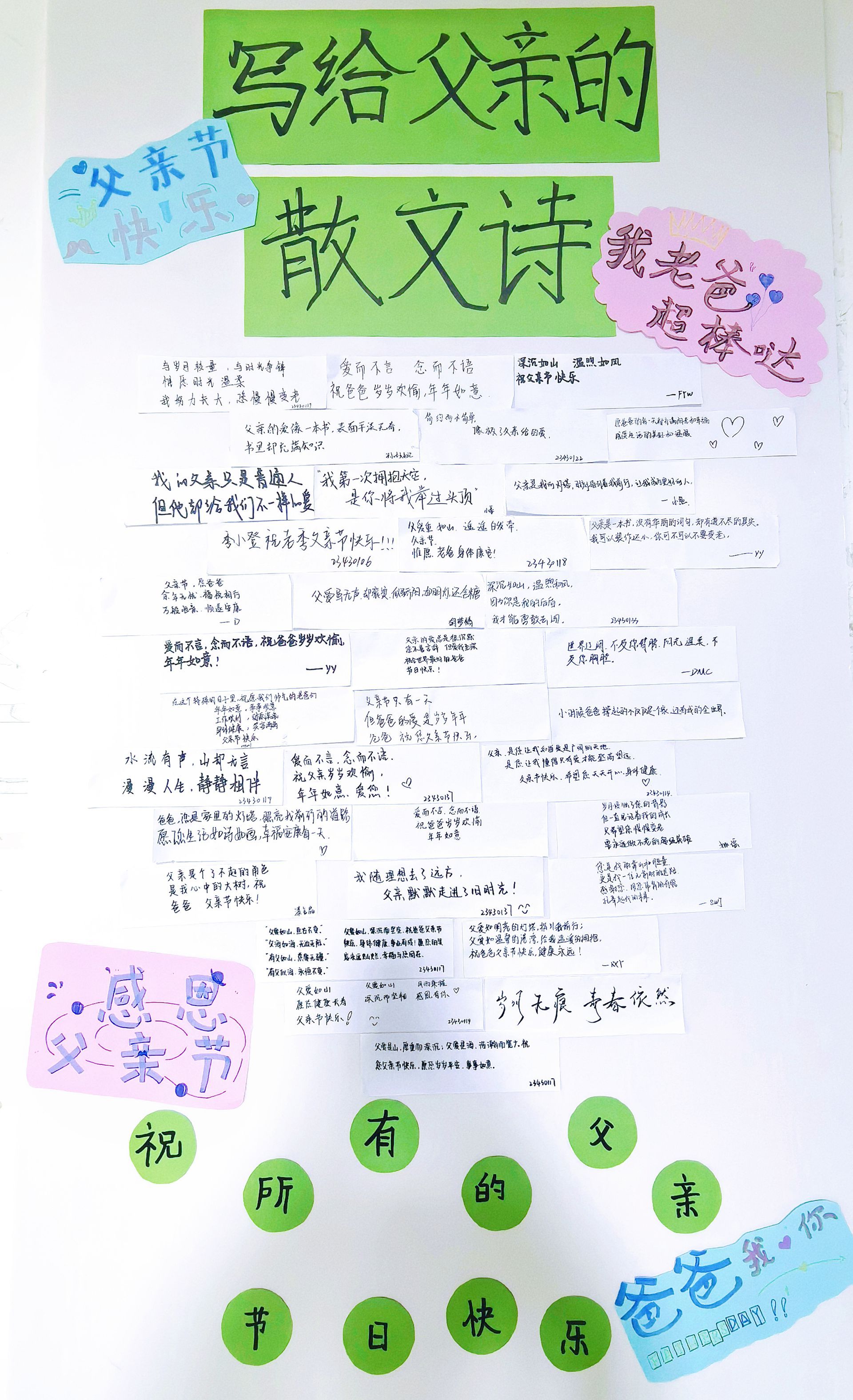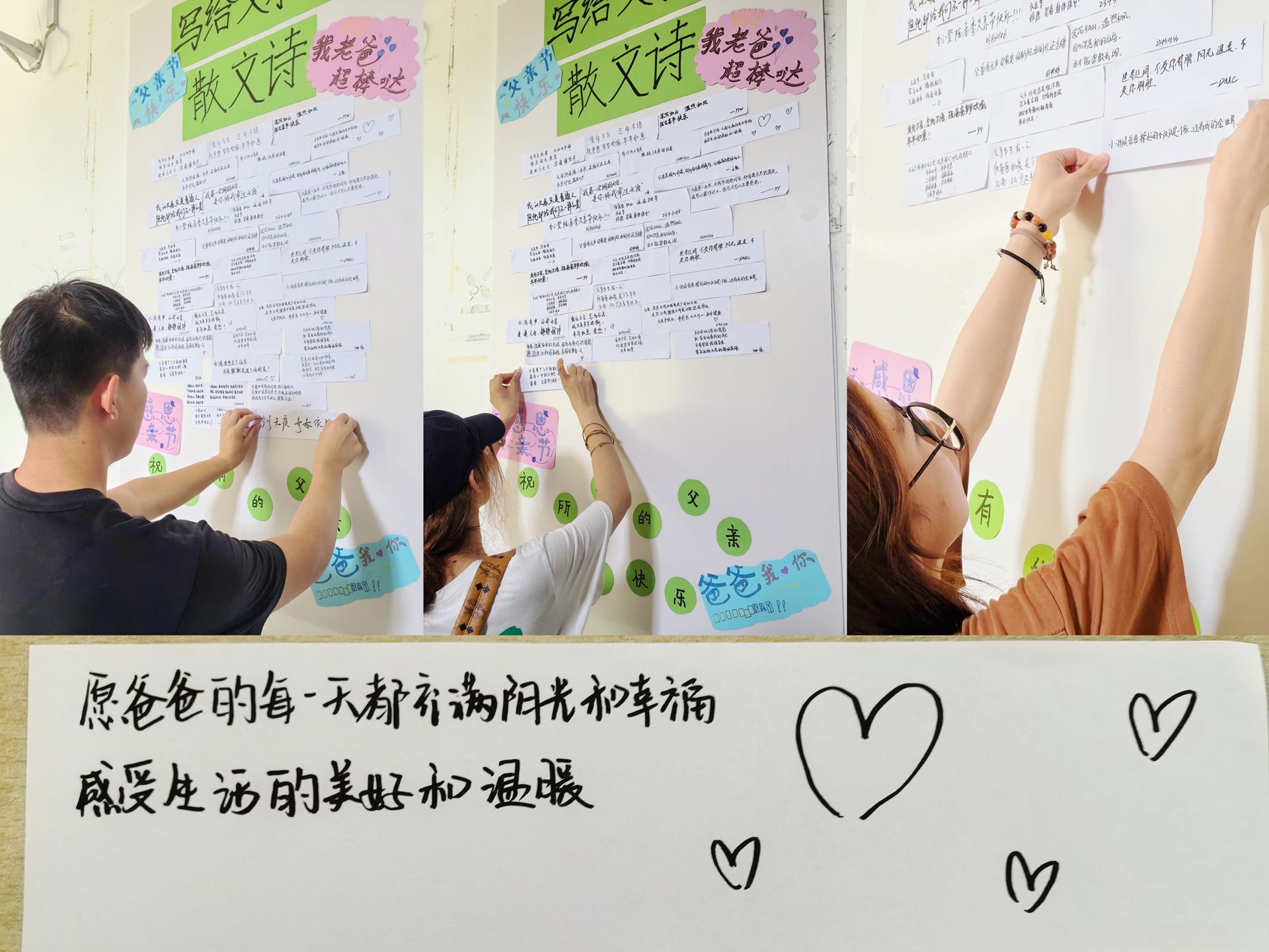 创作环节结束后,同学们将自己的纸条张贴在了8号楼墙壁上,每一首简短的散文诗都饱含深情,有的表达对父亲默默支持的感谢,有的描述与父亲共度的温馨时刻,还有的则是对父亲深沉的爱意的直接表达。