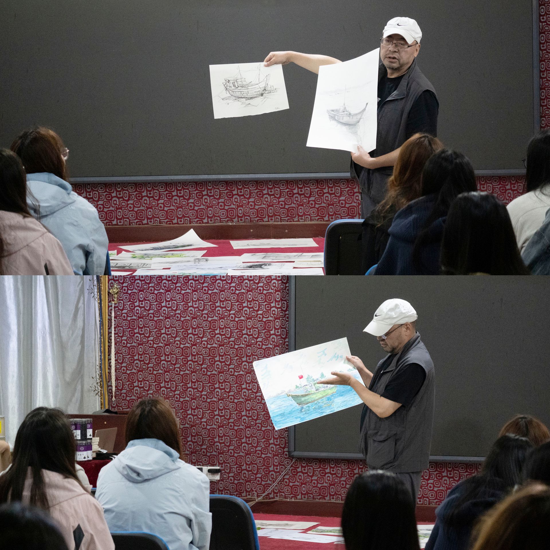 晚上回到酒店,专业课郭力老师会及时对同学们的写生作品进行讲评,他会仔细审视画面的布局是否均衡,物体的位置和大小安排是否合理。然后根据不同绘画媒介的特点,观察学生们对线条、色彩、明暗、质感等要素的掌握情况,并指出作品中技法运用的优点和缺点,帮助学生认识到自身在技艺上的长处和不足,从而更有针对性地进行练习和提高。对于表现力较弱的部分,他会通过示范和讲解,帮助学生理解如何通过细节刻画和情感注入,使作品更具感染力。