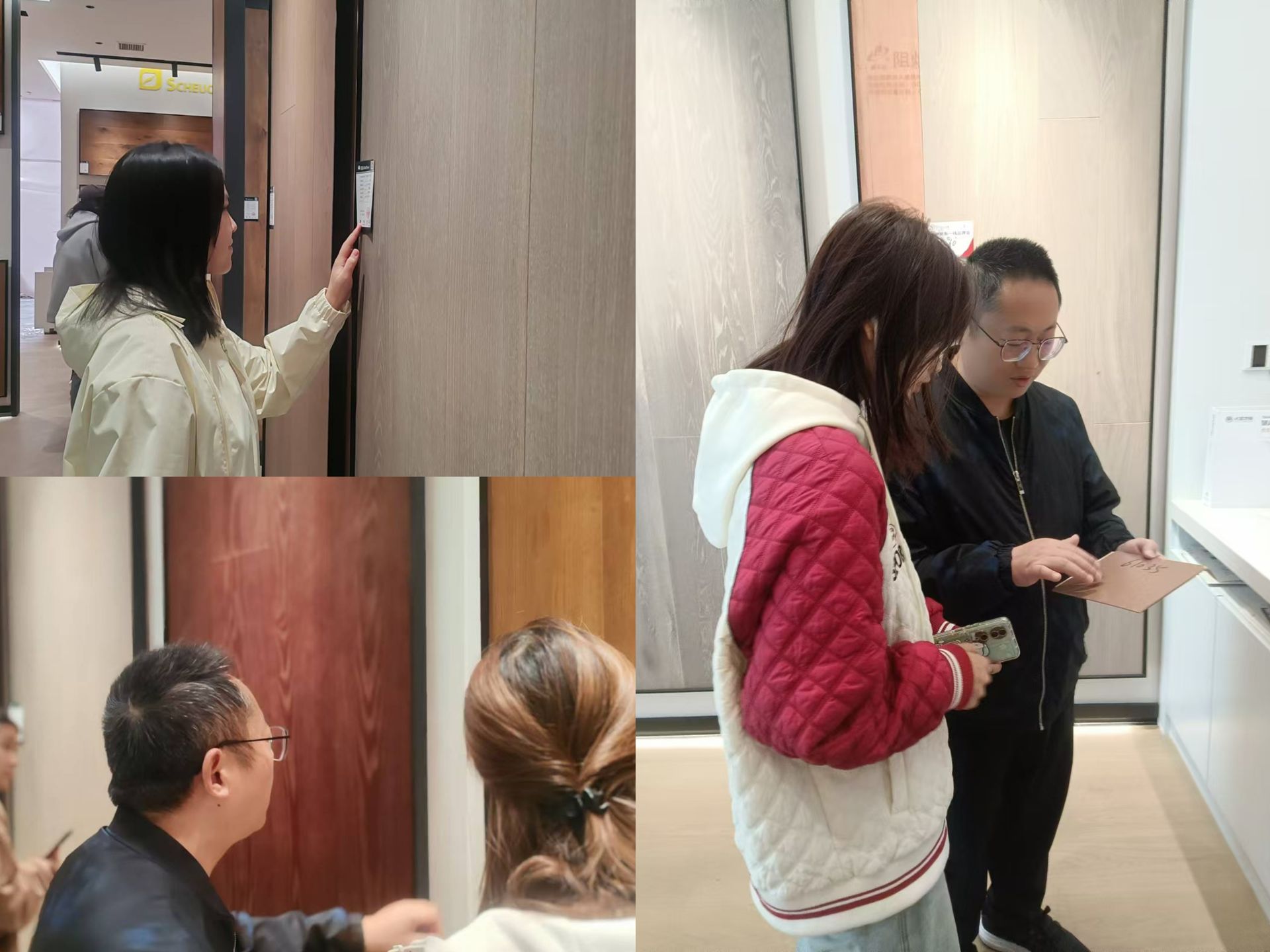 调研期间,同学们不仅聚精会神地聆听了商家对产品的细致讲解,还亲手触摸、细致观察了各类材料的质感、纹理与色彩。学生们积极发问,与商家围绕材料的性能、价格、施工复杂度等话题展开了深入的探讨。与此同时,马亮老师紧跟现代设计潮流,为学生们生动阐述了不同材料在家装中的实际应用与设计技巧。