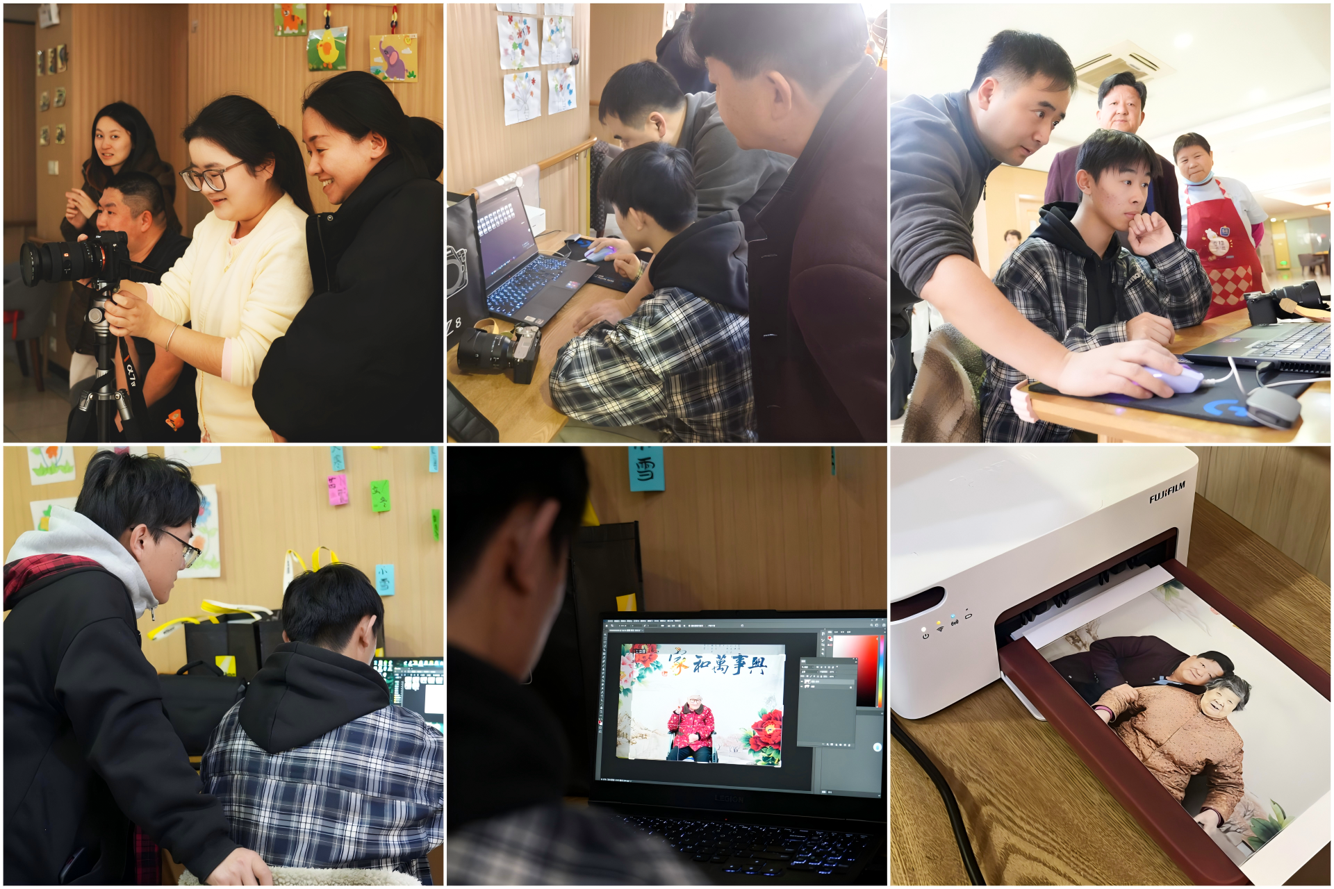 清晨的养老院,三脚架与反光板架起一方天地。学生们化身“时光捕手”,为敬老院里的老人量身定制肖像拍摄。他们俯身整理衣领的指尖传递着敬意,跪地调整角度的身影诠释着专业,快门起落间,不仅定格了老人布满沟壑却慈祥的面容,更激活了沉睡多年的记忆。“孩子们把我拍的都不像自己了,好像回到了年轻的时候!”一位老人看这个相片里的自己不禁有些哽咽。