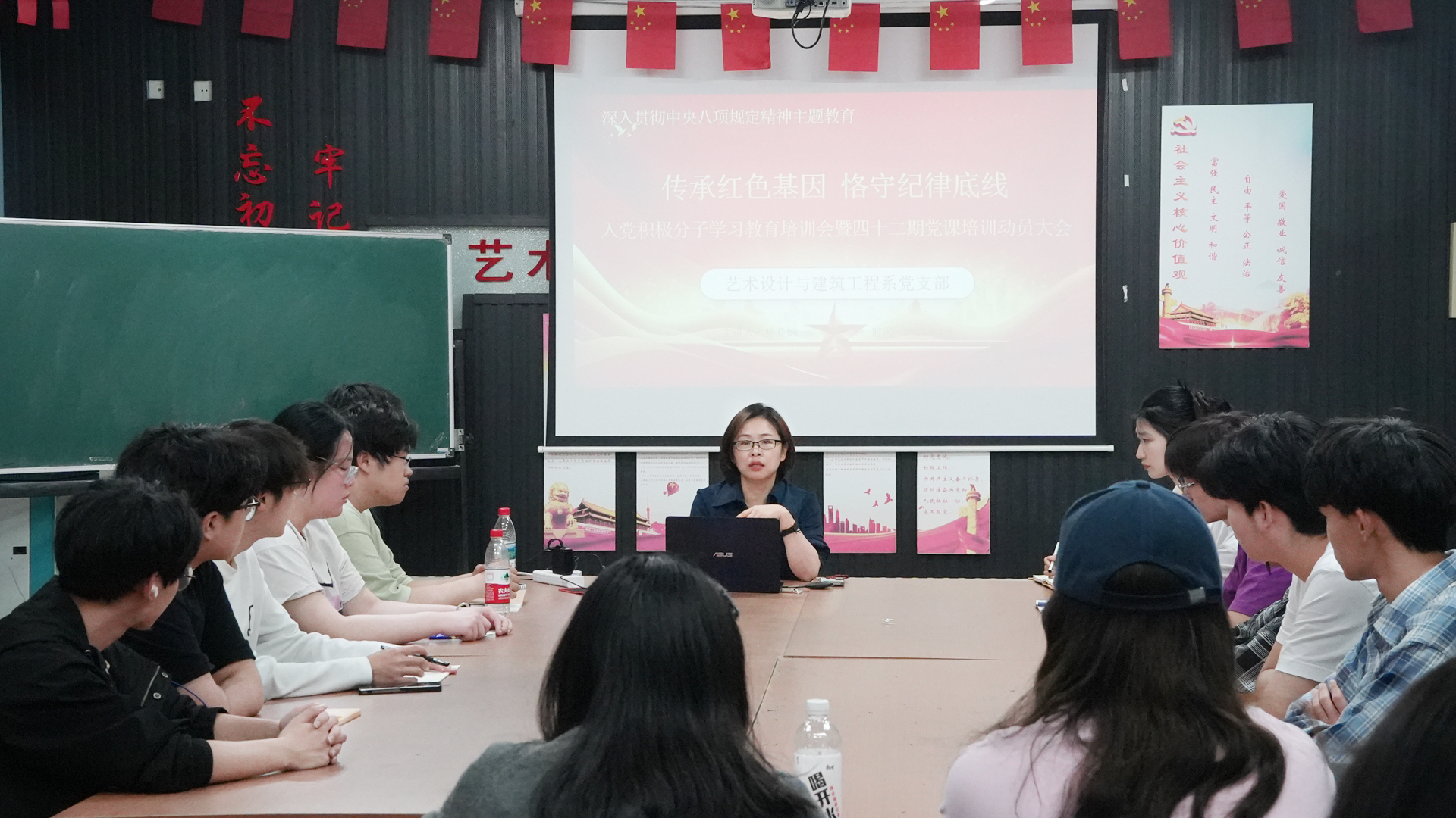 4月24日讯 为加强入党积极分子党性修养,筑牢纪律意识,今日下午,艺术设计与建筑工程系党支部召开第42期党课培训动员大会,系党支部书记杨春娟主讲,35名入党积极分子及党员代表参会。会上,杨书记以“传承红色基因 恪守纪律底线”为主题,结合中央八项规定精神,为全体学员上了一堂生动的党性教育课。
