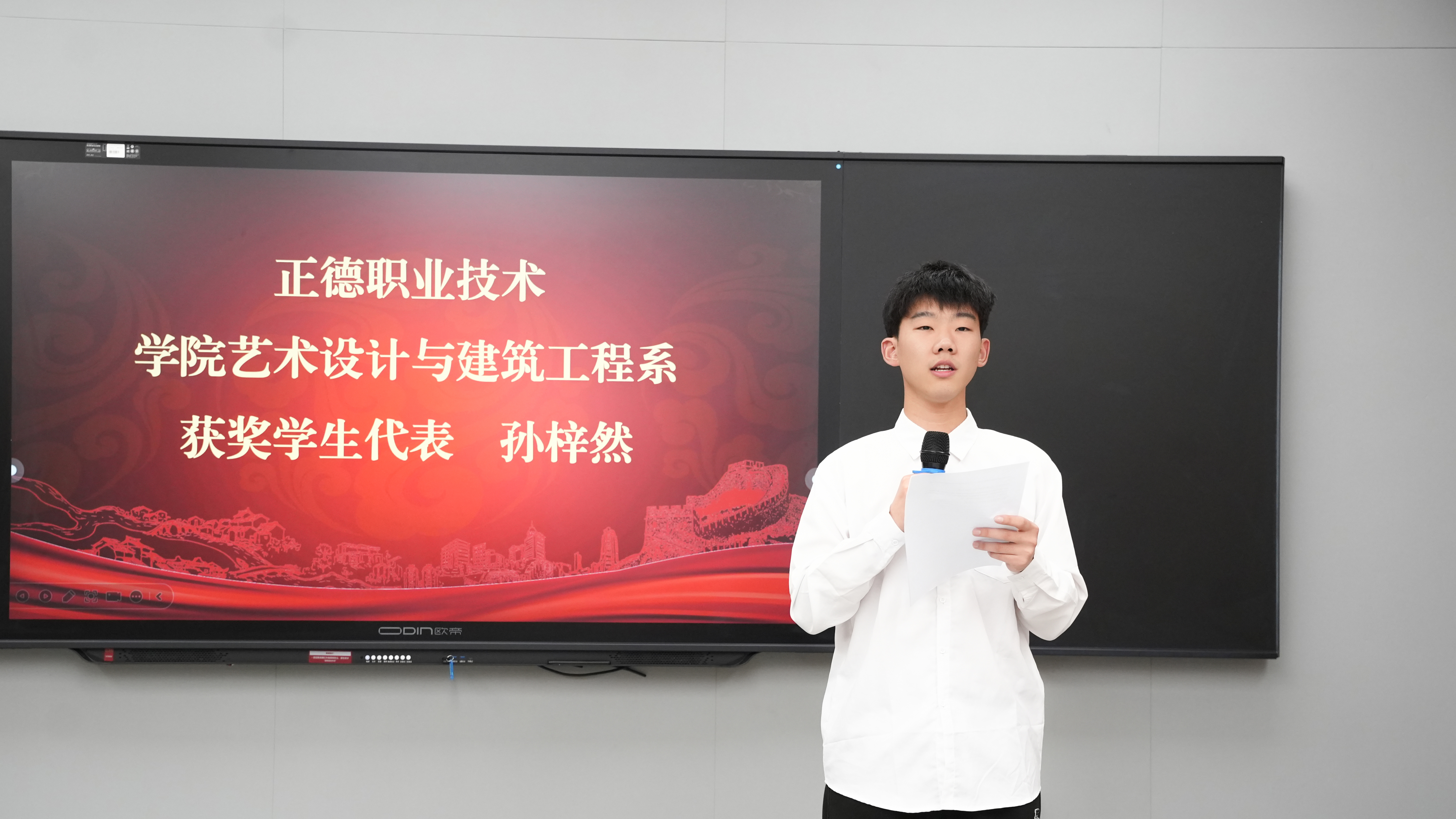 随后,获奖学生代表、指导教师代表分别作了发言。工程造价专业孙梓然同学分享自己备赛历程以及参赛心得体会。指导教师代表刘凤以“三心育人”理念为主题,回顾了训练及比赛中的点点滴滴,分享了自己的指导心得。期望来年再接再厉、再创佳绩。