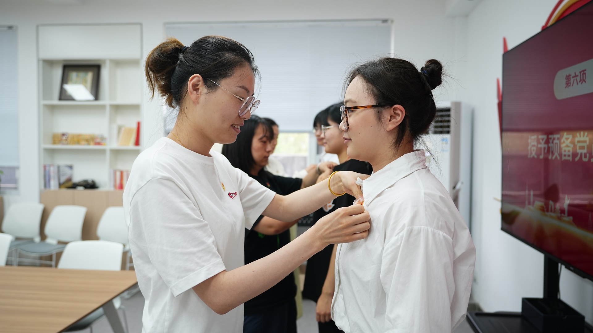 仪式在庄严的《国际歌》声中拉开序幕。杨阳代表系党支部宣读2025年上半年新发展党员名单,入党介绍人为徐婧怡、刘健、鲁皖岭3名新发展党员佩戴党徽。