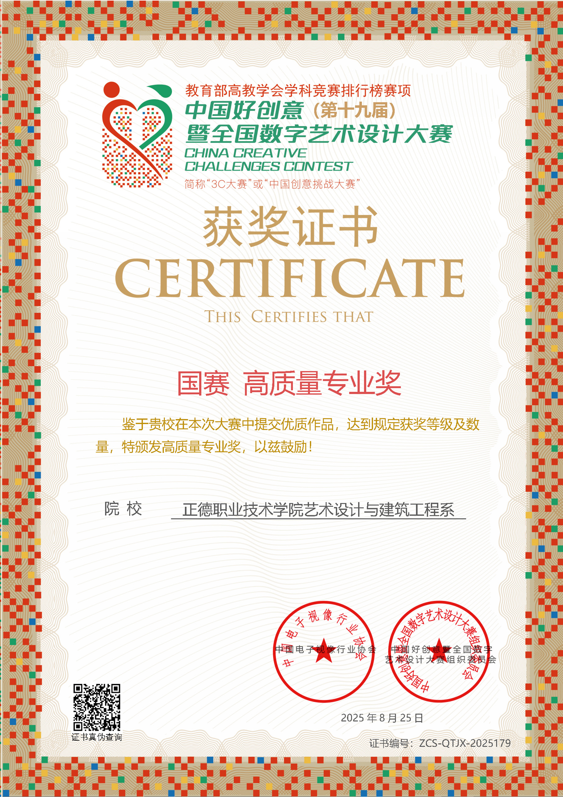 8月25日,第十九届中国好创意暨全国数字艺术设计大赛园满落幕,天博体育 艺术设计与建筑工程系师生凭借卓越的创意实力与专业水平,荣获国家级一等奖3项、二等奖1项、三等奖3项,省级奖项5项,并首次摘得国赛“高质量专业奖”,获奖数量与层级均创历史新高,充分彰显了系部在数字艺术教育领域的深厚积淀与创新活力。