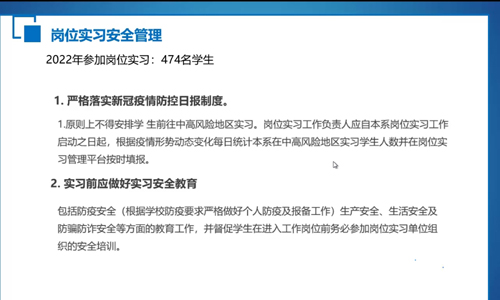 陈宏波主任系统地进行了实习工作的全面布置,从为什么要实习、如何实习、实习效果三个维度完整地介绍了实习工作,包括实习的必要性、目的和意义,实习基本情况及途径、实习时间、实习任务与要求、实习注意事项等,让学生层次分明、条理清晰地全面了解了实习,并进一步明确了自己要做的准备工作。