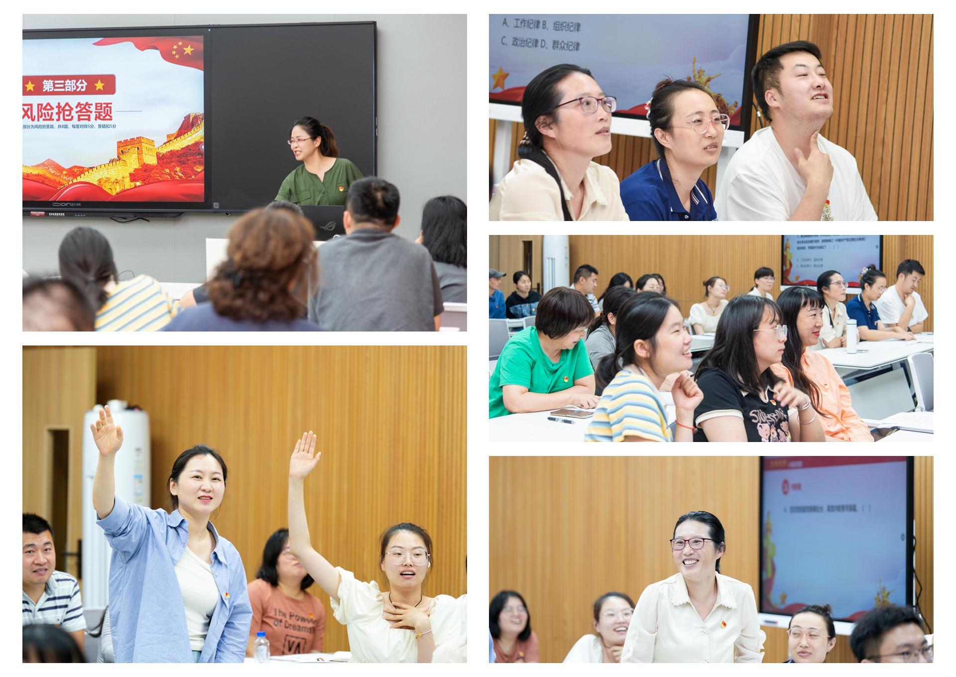 紧接着,活动还举行了党纪条例知识竞赛。竞赛内容涵盖了党的纪律、法律法规以及师德师风等方面,旨在检验党员教师对党纪条例的掌握情况。竞赛采用了小组赛,分小组必答、小组抢答、风险抢答三个部分,在小组必答环节,各小组党员教师们沉着冷静,展现出了扎实的党纪条例知识储备。小组抢答环节更是紧张刺激,党员教师们争分夺秒,积极抢答,现场气氛热烈。风险抢答环节则考验了党员教师们的勇气和智慧,他们勇于挑战,敢于冒险,充分展现了党员教师的风采。经过激烈的角逐,最终第一小组获得了一名,这次竞赛不仅检验了党员教师们对党纪条例的掌握情况,也激发了大家学习党纪条例的热情和积极性。