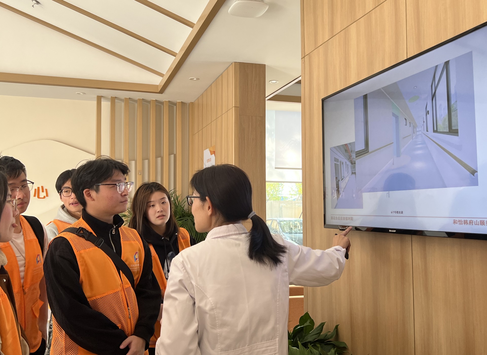 其次,在姜院长的带领下,志愿者们对养老院内进行了参观。姜院长介绍到,和怡韩府山颐养中心不仅仅是人们所熟知的“养老院”,也是社会福利中心。志愿者们在参观老人房间时,走进老人身边,陪老人聊天谈心。接着,志愿者们还走进厨房。协助工作人员派发晚餐,为行动不便的老人喂饭。切身的投入到关爱老人的行动中。