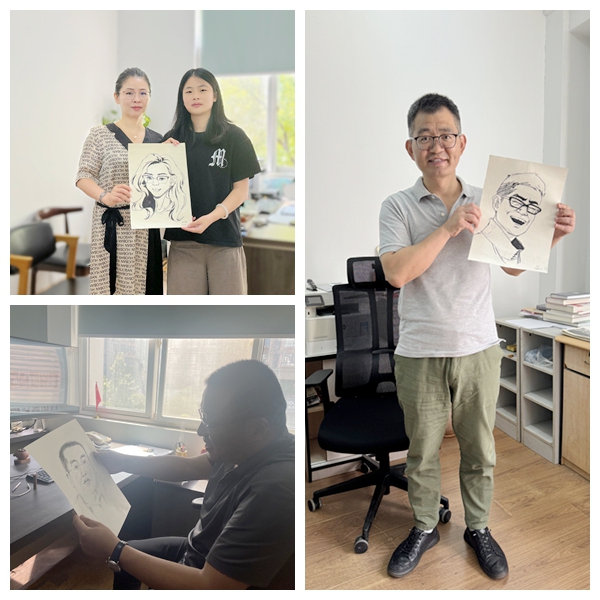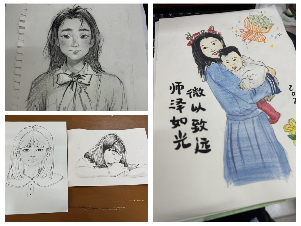 在画像创作过程中,同学们精心选材、用心设计、各展所长,用小小的画笔描绘着、勾勒着,使老师的鲜明形象跃然于纸上。画作形式不一,或素描或速写或水粉,但这一笔一画中却凝结了师生相处的点滴,饱含着深切爱意,表达着深深祝福,更展现了师生之间的深情厚谊。